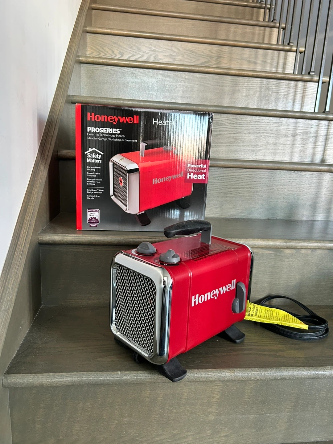 Honeywell ProSeries portable heater. It's powerful and designed for directional heat. Ideal for garages, workshops, or basements. Durable metal housing and safety features included.