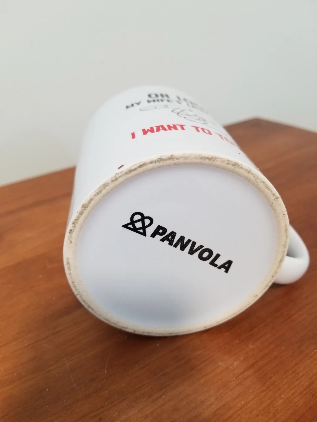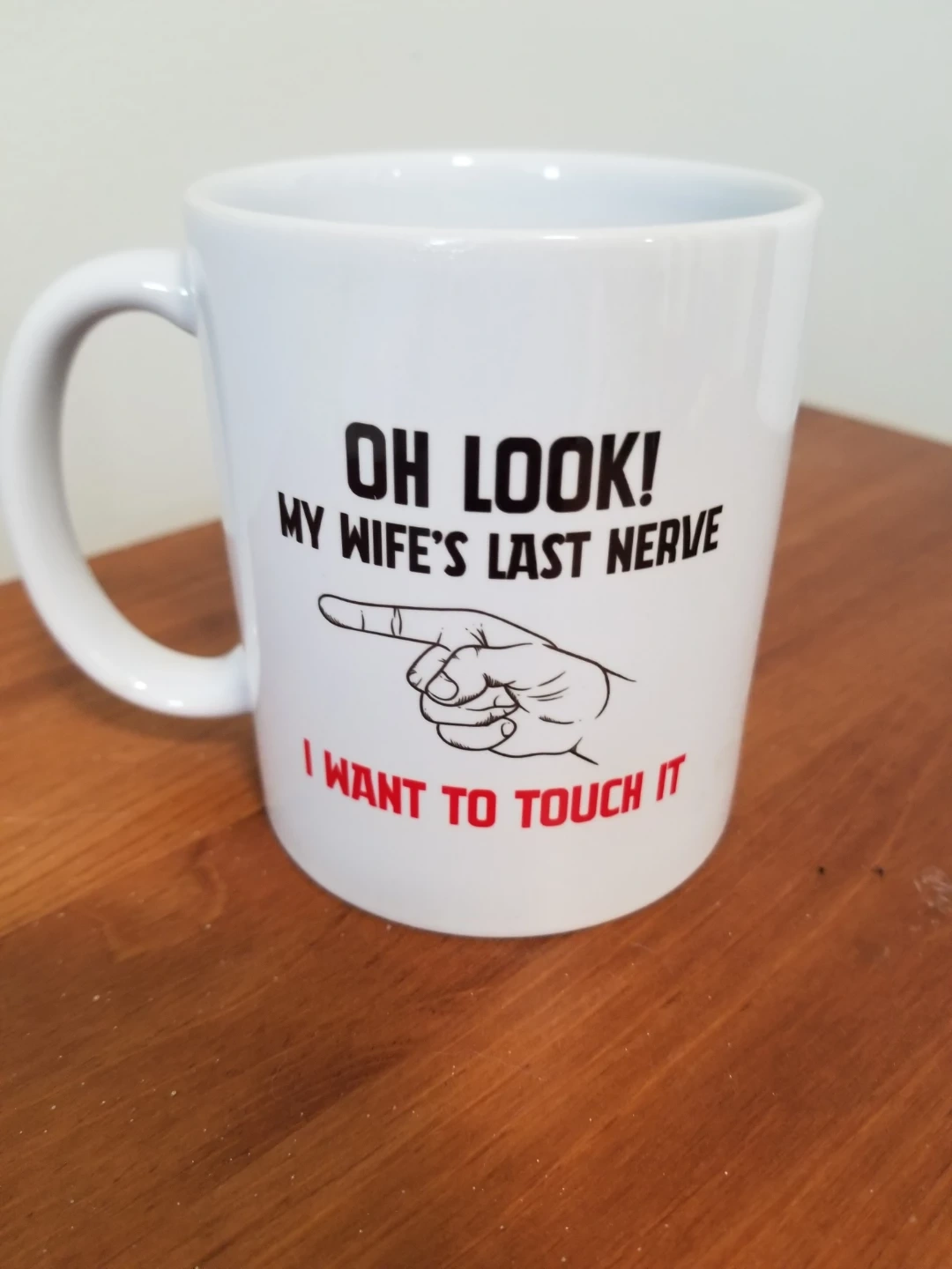 This is a white ceramic mug by Panvola with a humorous graphic and text. It reads 'OH LOOK! MY WIFE'S LAST NERVE I WANT TO TOUCH IT'. This mug would be a fun gag gift for someone with a good sense of humour! Brand new