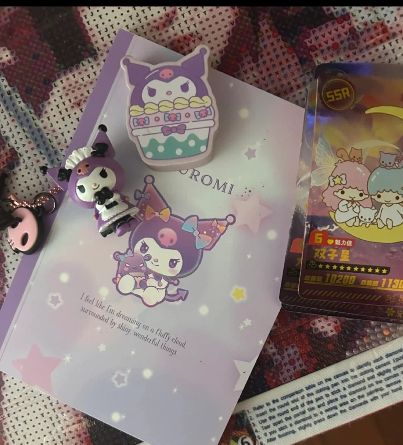 This set features a Sanrio Kuromi notebook with adorable graphics and a cute maid-outfit Kuromi keychain. It also includes a Little Twin Stars SSR trading card. It is perfect for a Sanrio fan, and the official Sanrio Kuromi eraser, not asking for 5 each like most people I just mean 5 all together