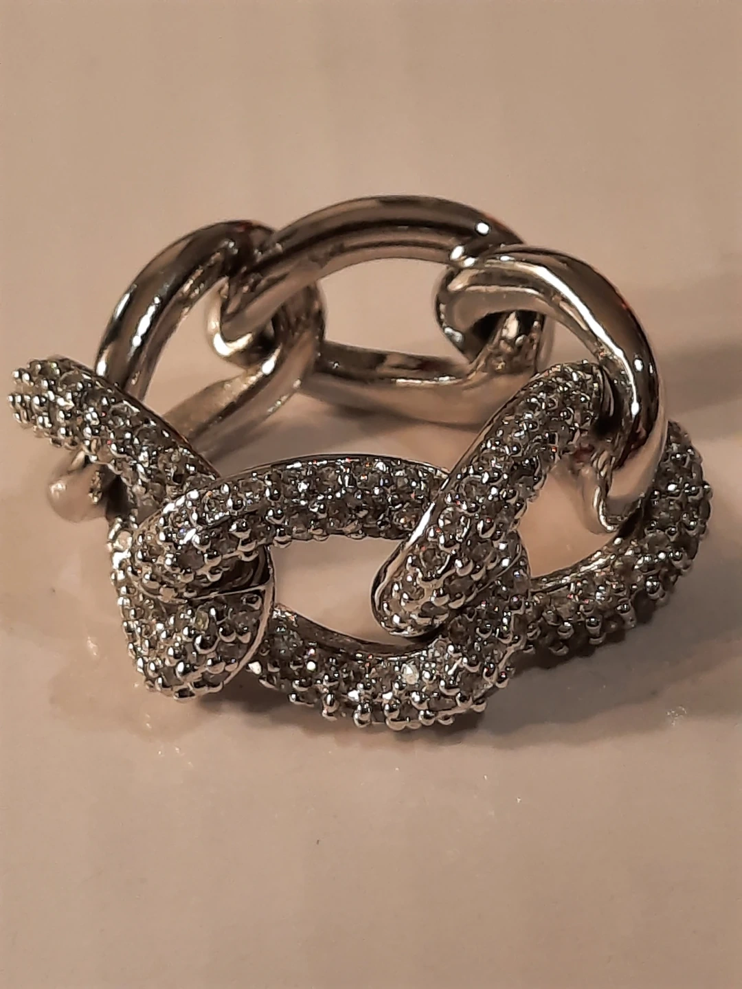 This ring features a bold, chunky link design. One side is accented with sparkling stones for extra flair. It's a statement piece that catches the light beautifully.