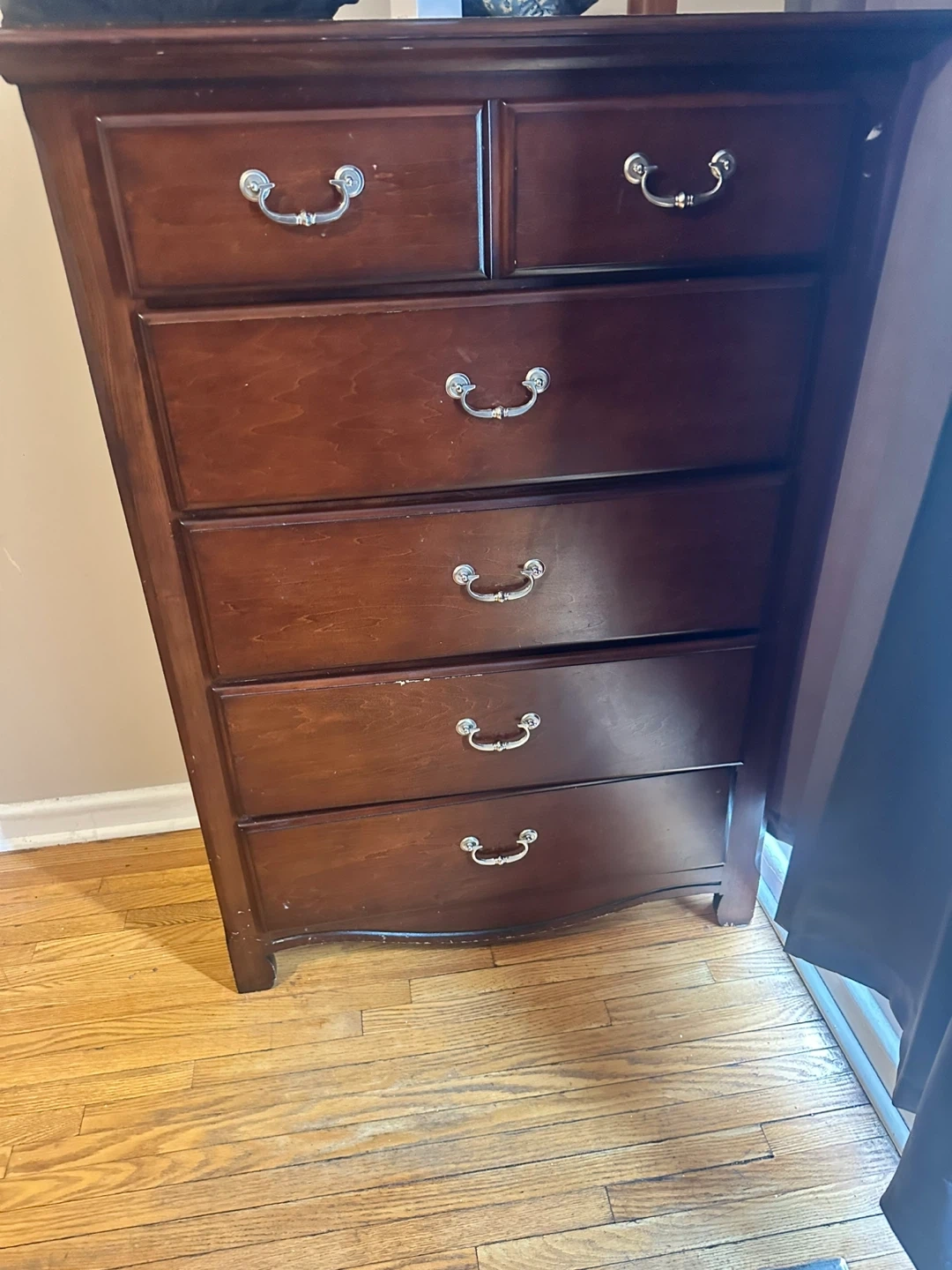 A dark wood dresser with six drawers. It has ornate silver hardware. The wood has a warm stain.