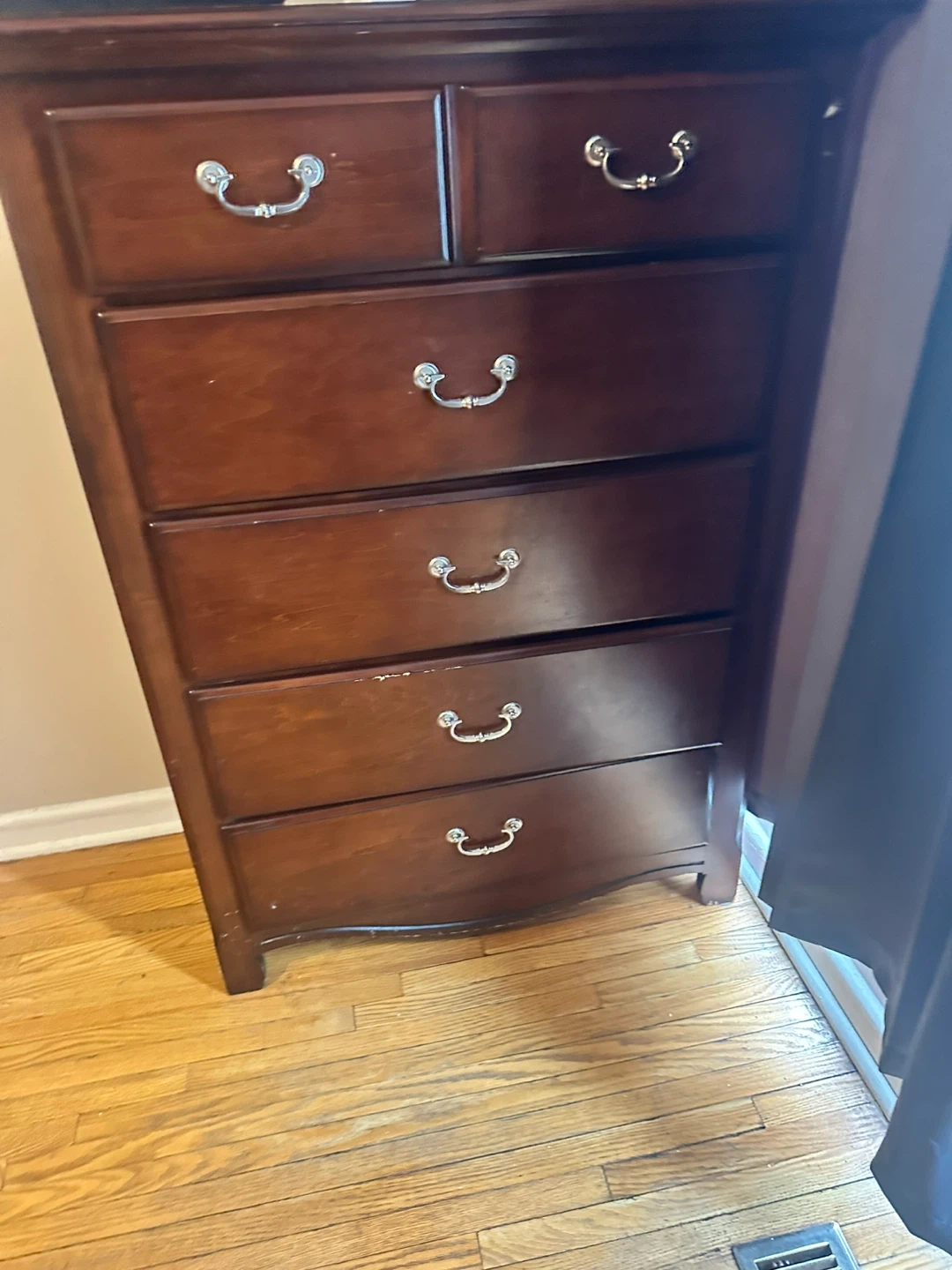 A dark wood dresser with six drawers. It has ornate silver hardware. The wood has a warm stain.