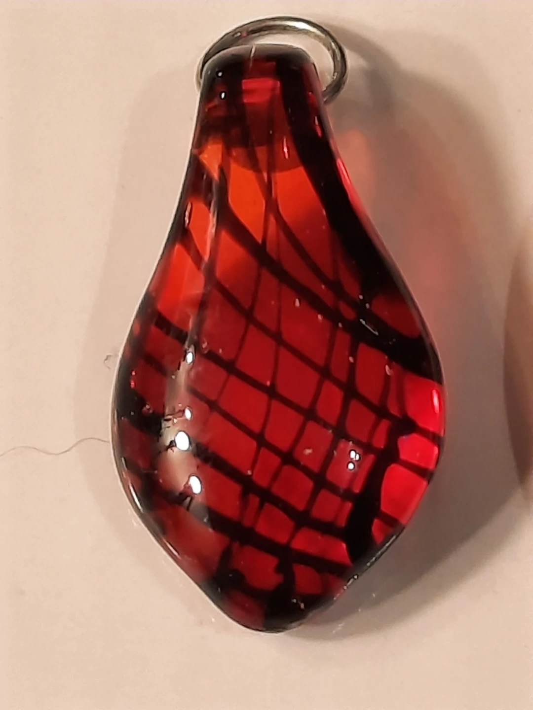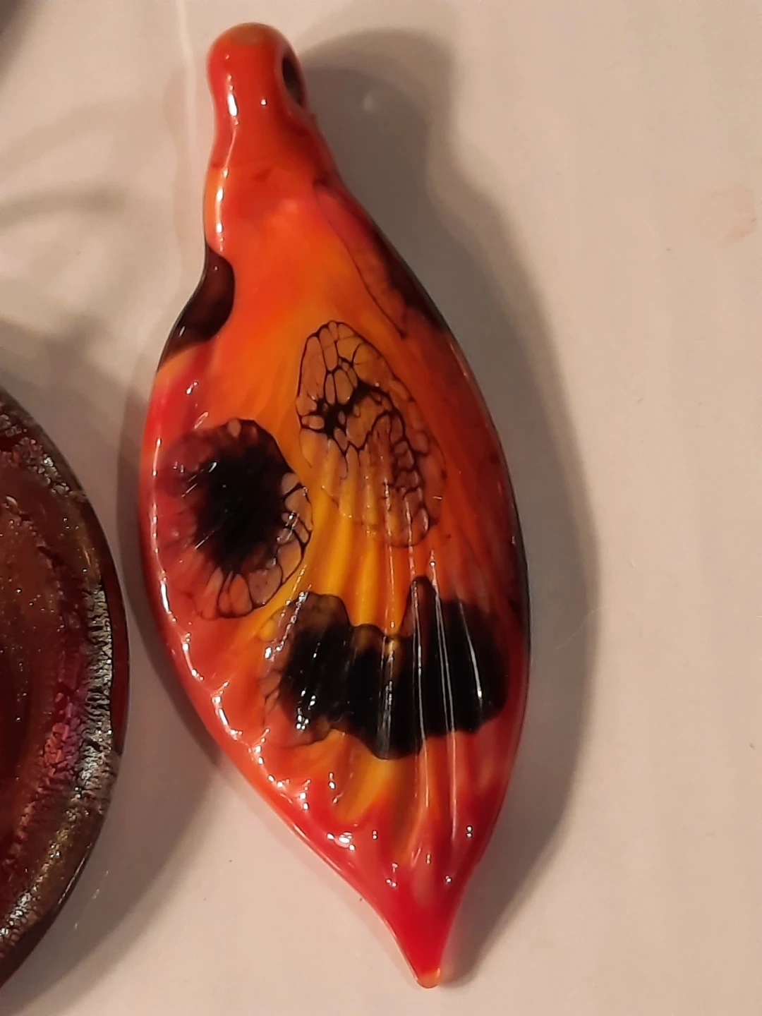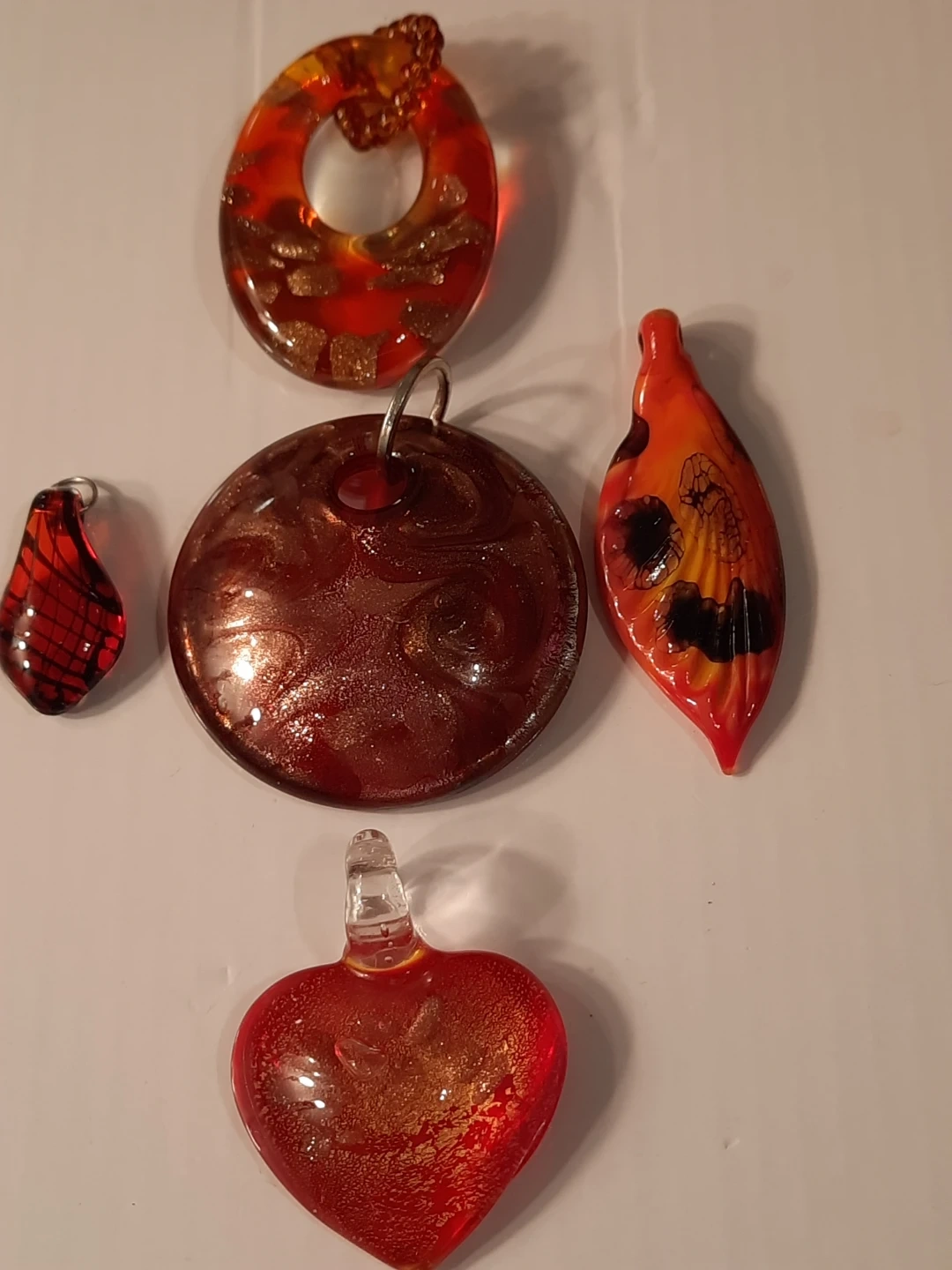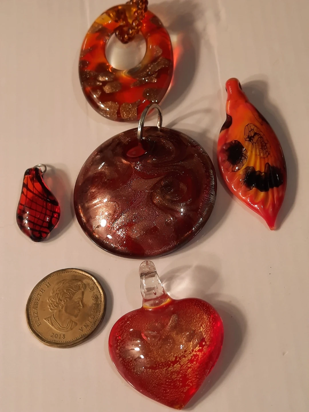 A collection of assorted Murano style glass pendants. Features include a heart shape, round, oval, and a leaf shape. They have a vibrant red and gold colour palette. Glass material.