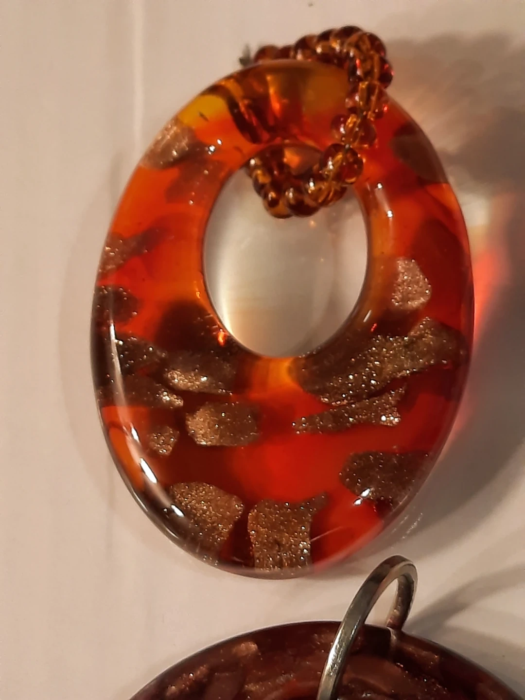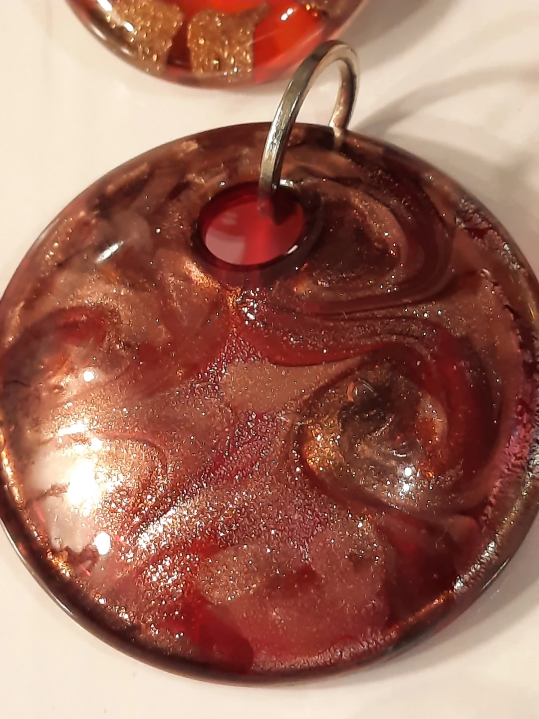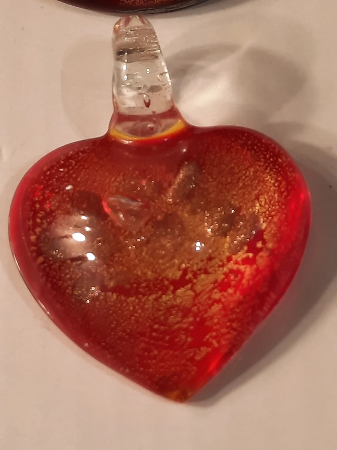 A collection of assorted Murano style glass pendants. Features include a heart shape, round, oval, and a leaf shape. They have a vibrant red and gold colour palette. Glass material.