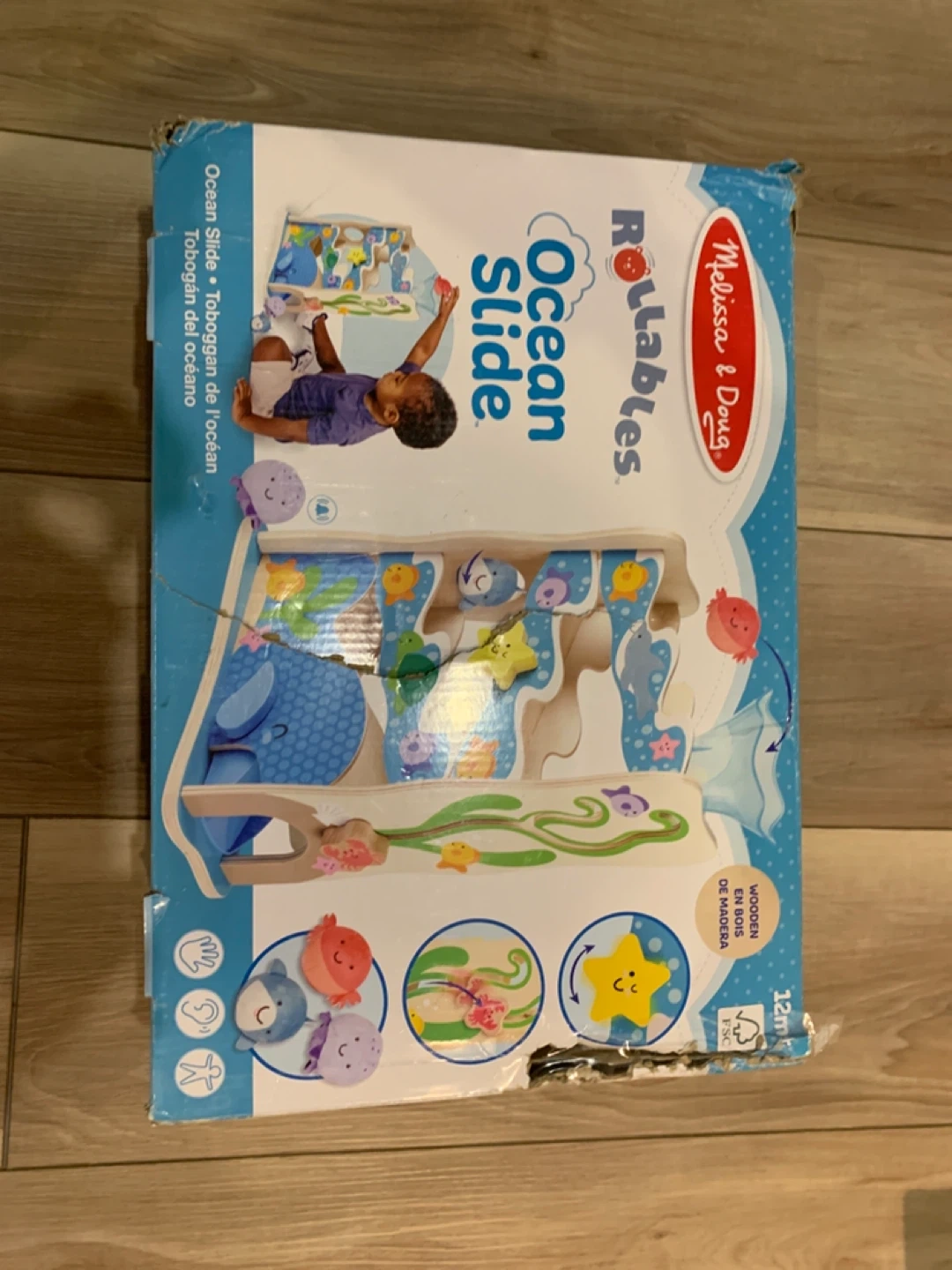 This is the Melissa & Doug Rollables Ocean Slide toy. It's made of wood and features cute ocean creatures. The set includes multiple rolling balls. Suitable for ages 12 months and up!