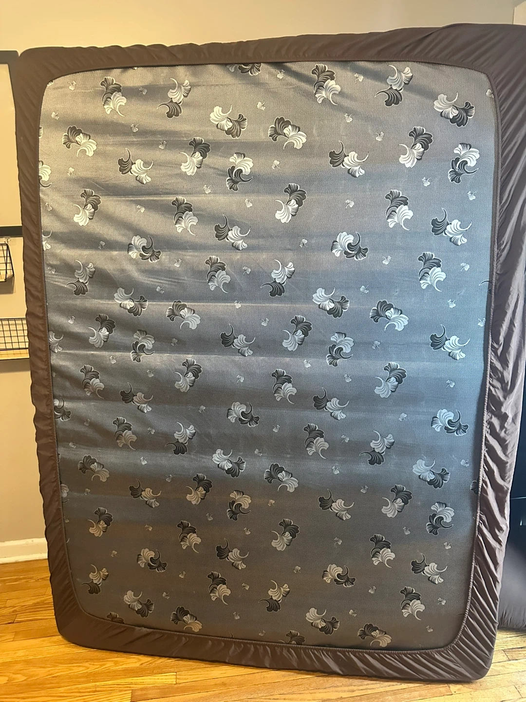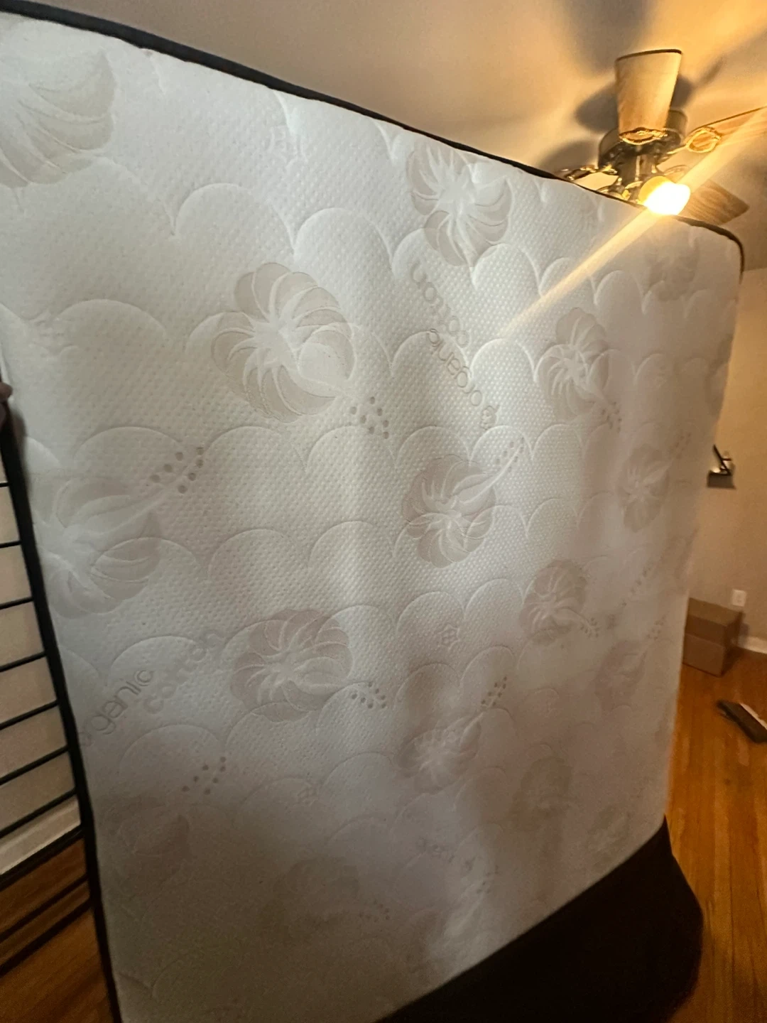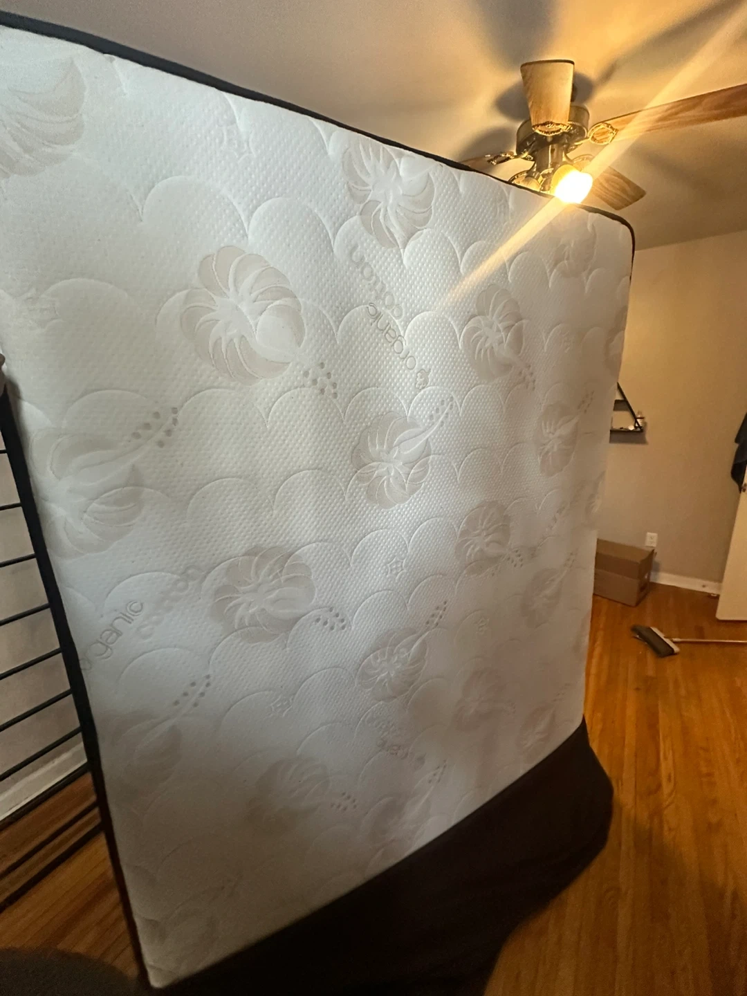 This is a full-size mattress with an organic cotton top. It's in good condition, ready for a new home. Provides a comfortable sleeping surface. This mattress is great for adding to a bed frame.