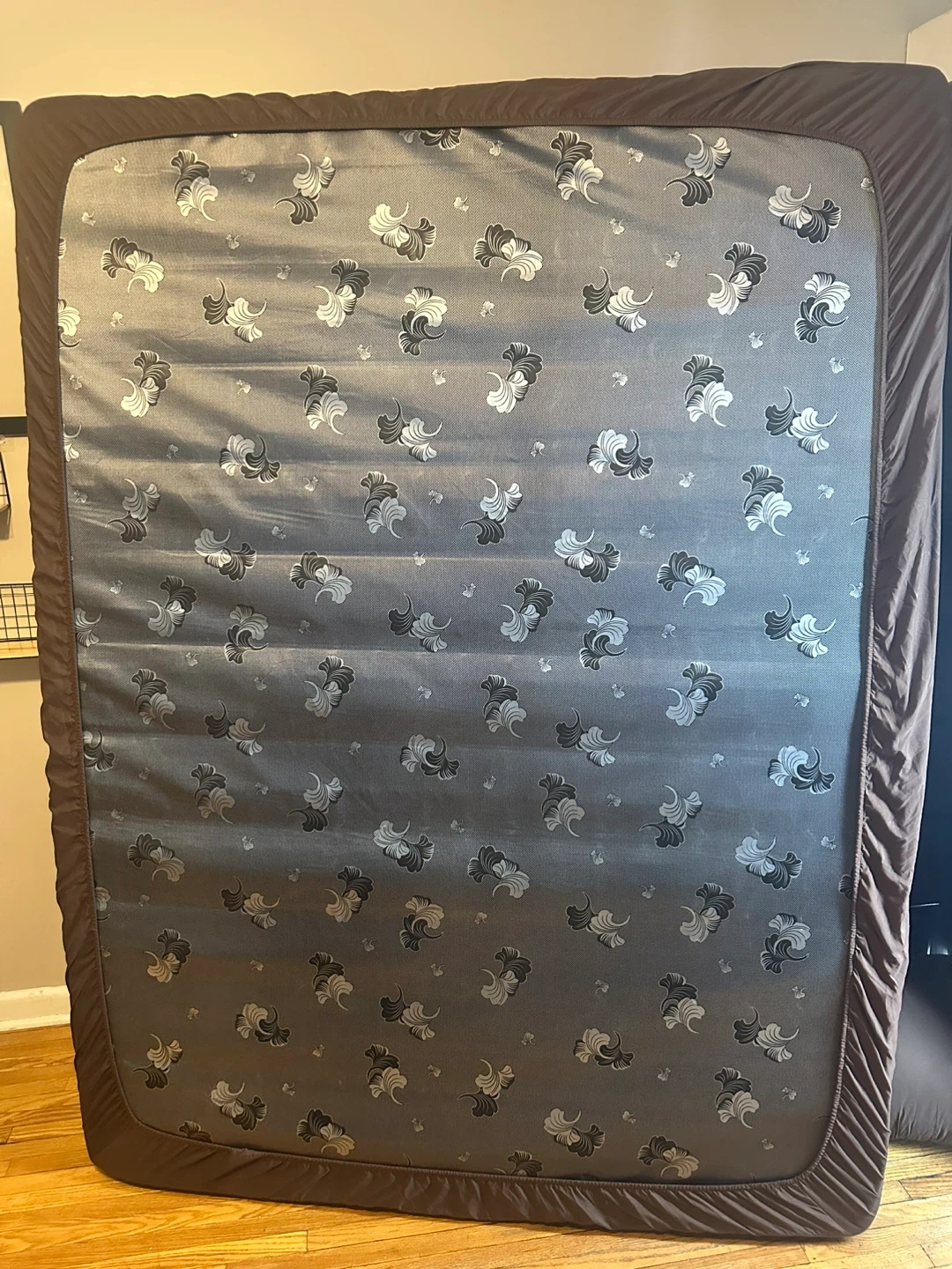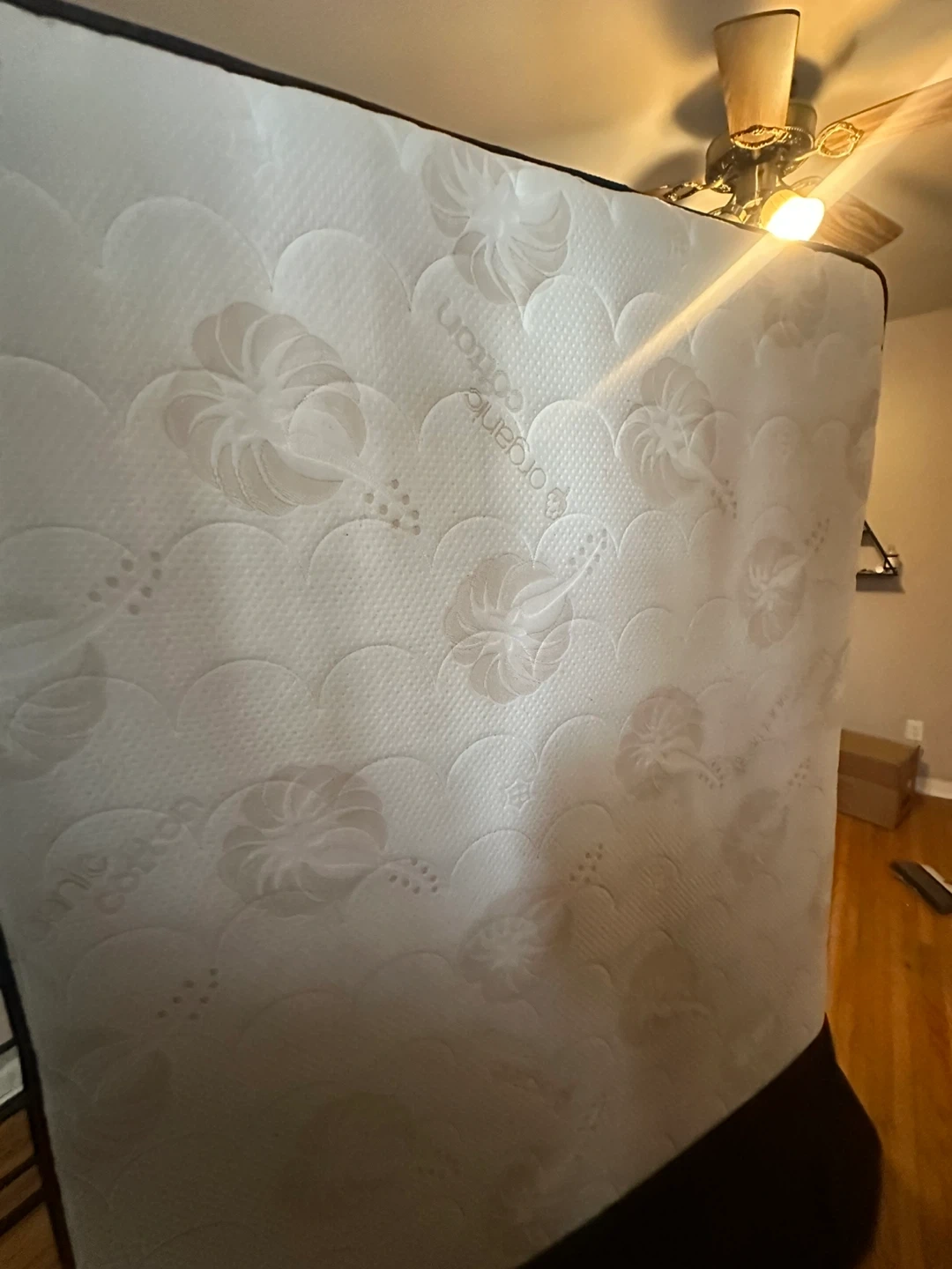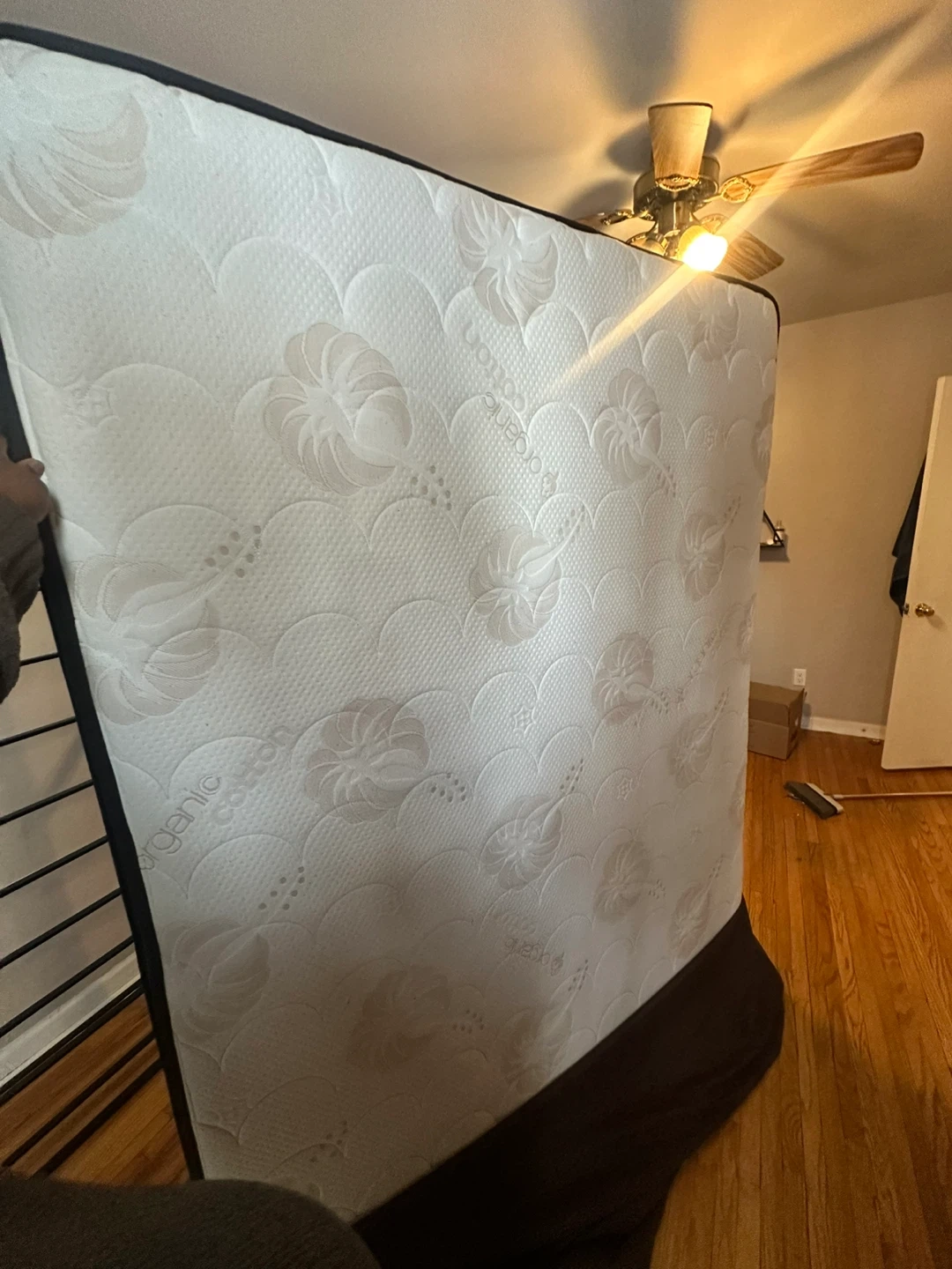 This is a full-size mattress with an organic cotton top. It's in good condition, ready for a new home. Provides a comfortable sleeping surface. This mattress is great for adding to a bed frame.