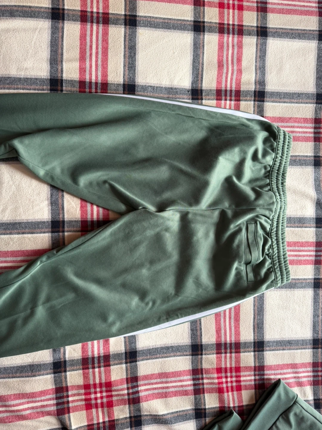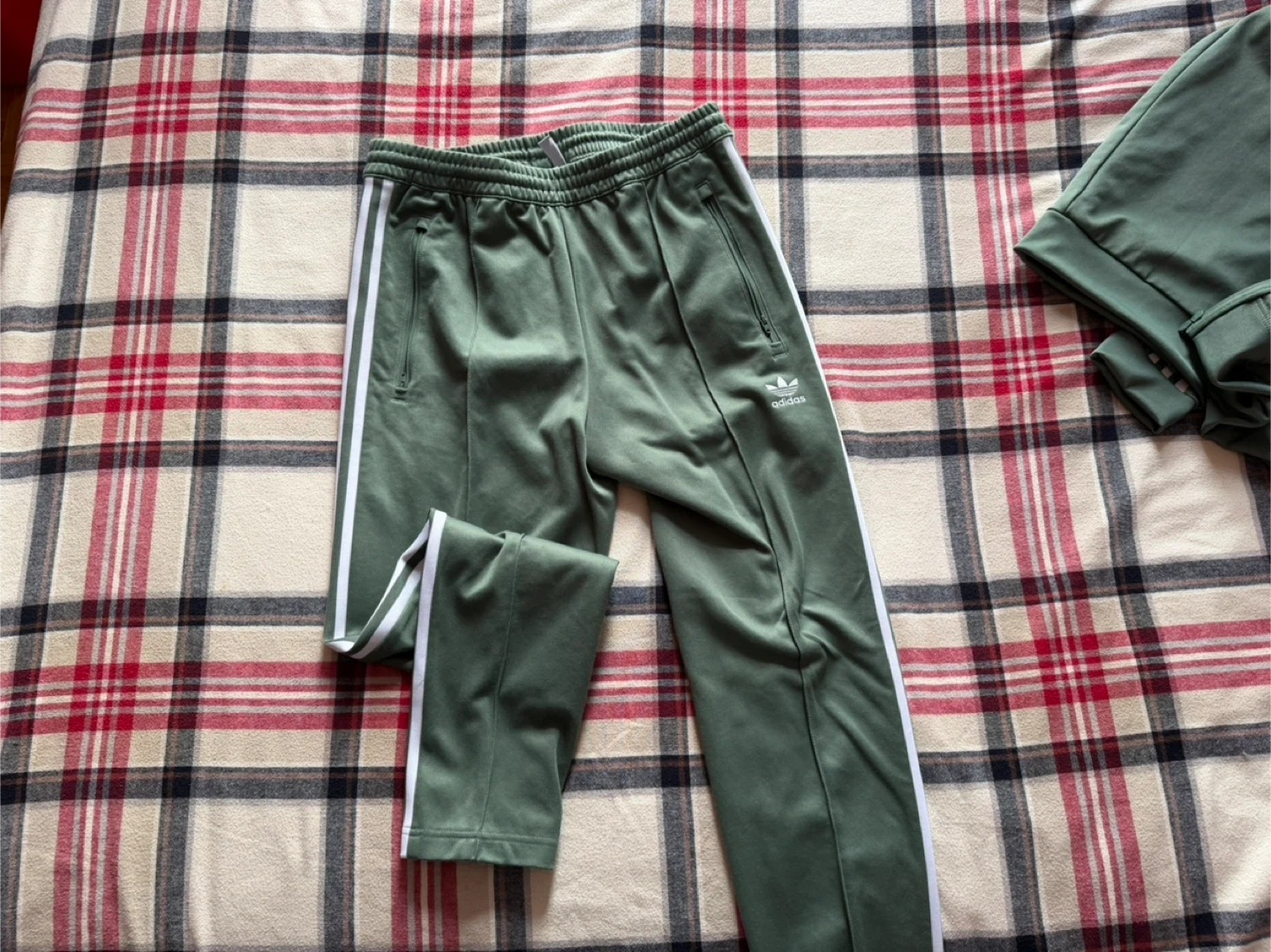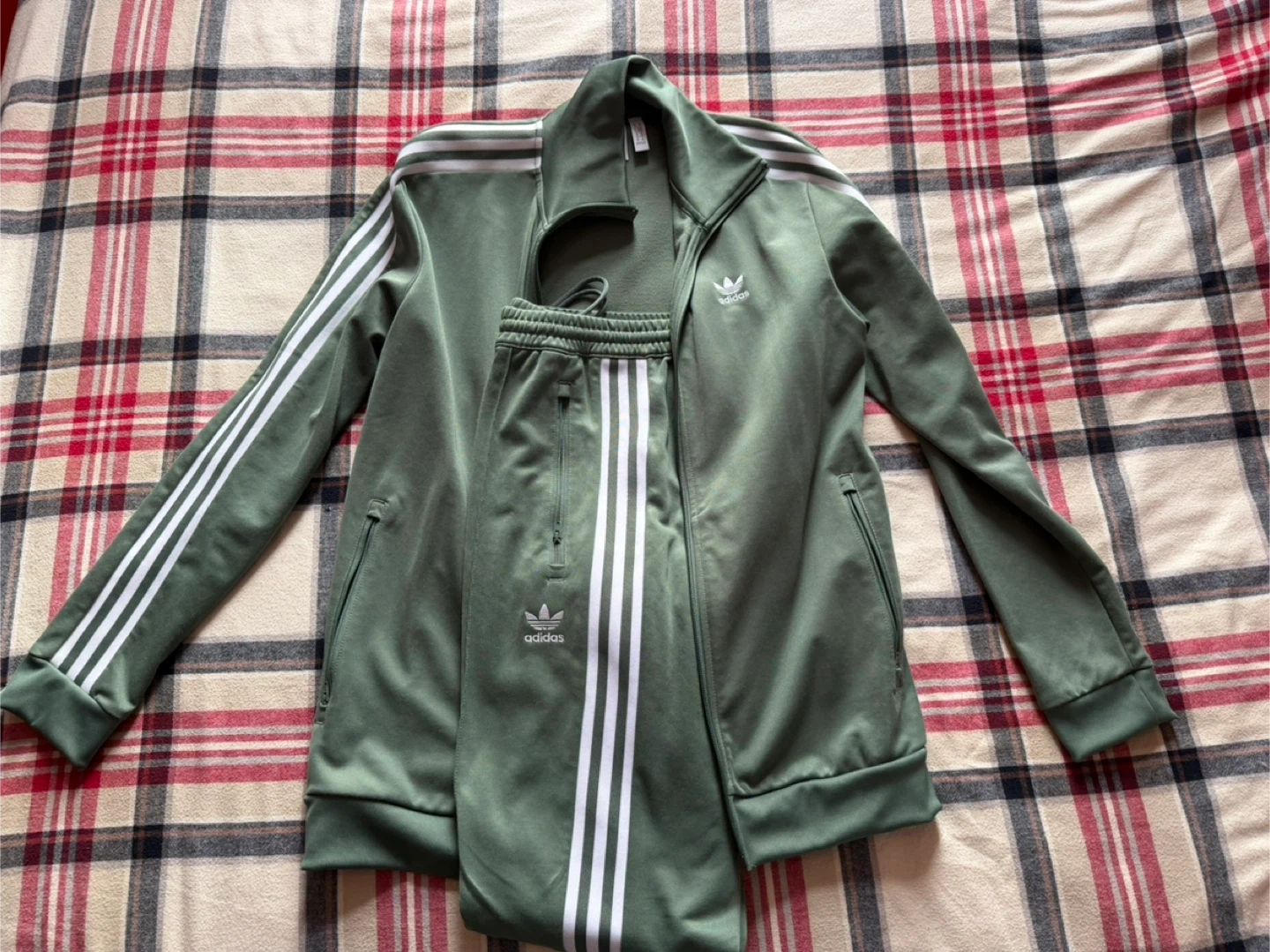 This is an Adidas tracksuit set, including a jacket and pants. It's an olive green colour with white stripes. It's made from a smooth fabric, perfect for active wear or casual outings.