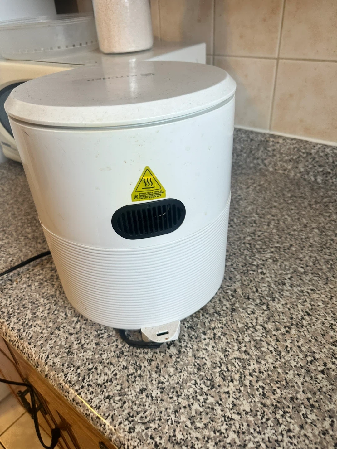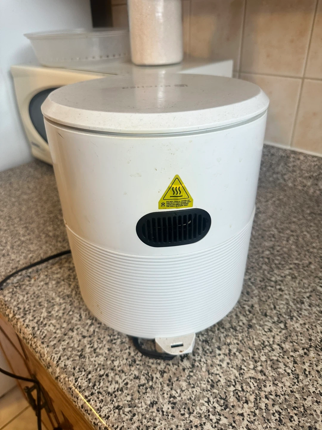 White KITCHER air fryer with a removable basket. It's a countertop appliance designed for quick cooking. Its compact size makes it suitable for smaller kitchens.