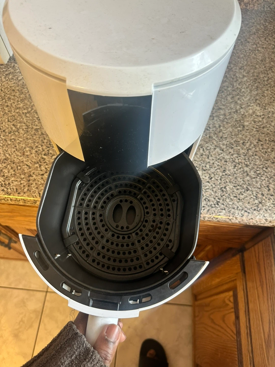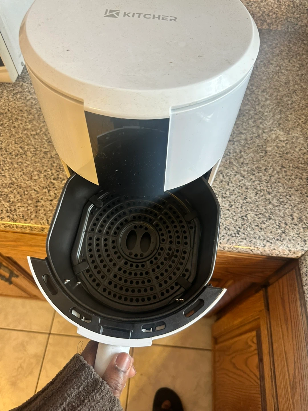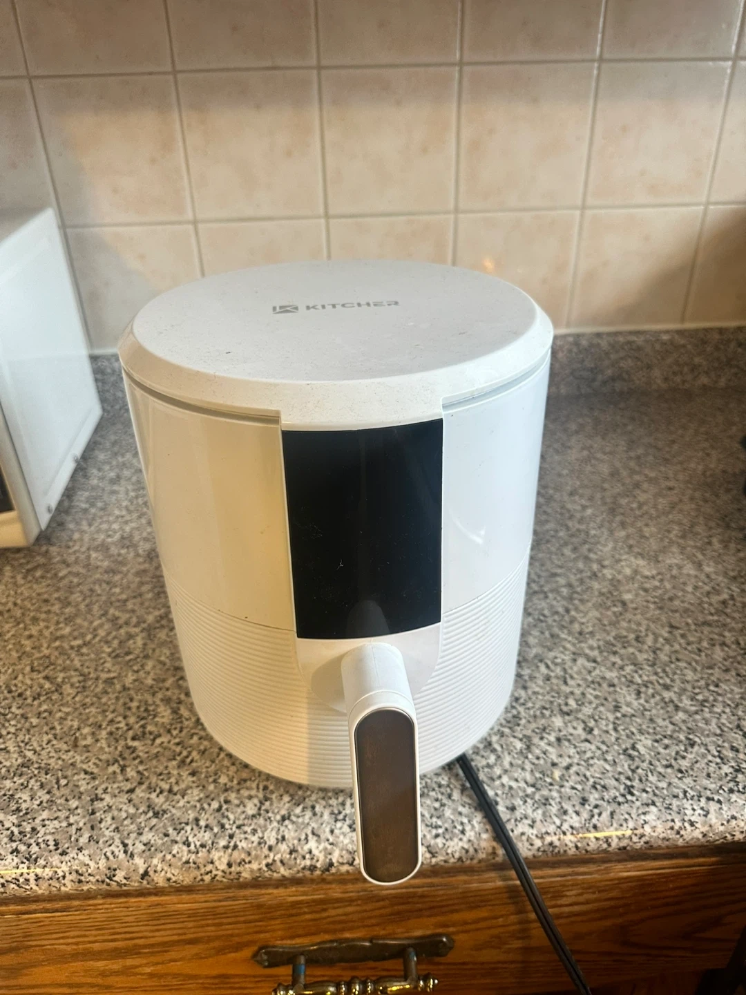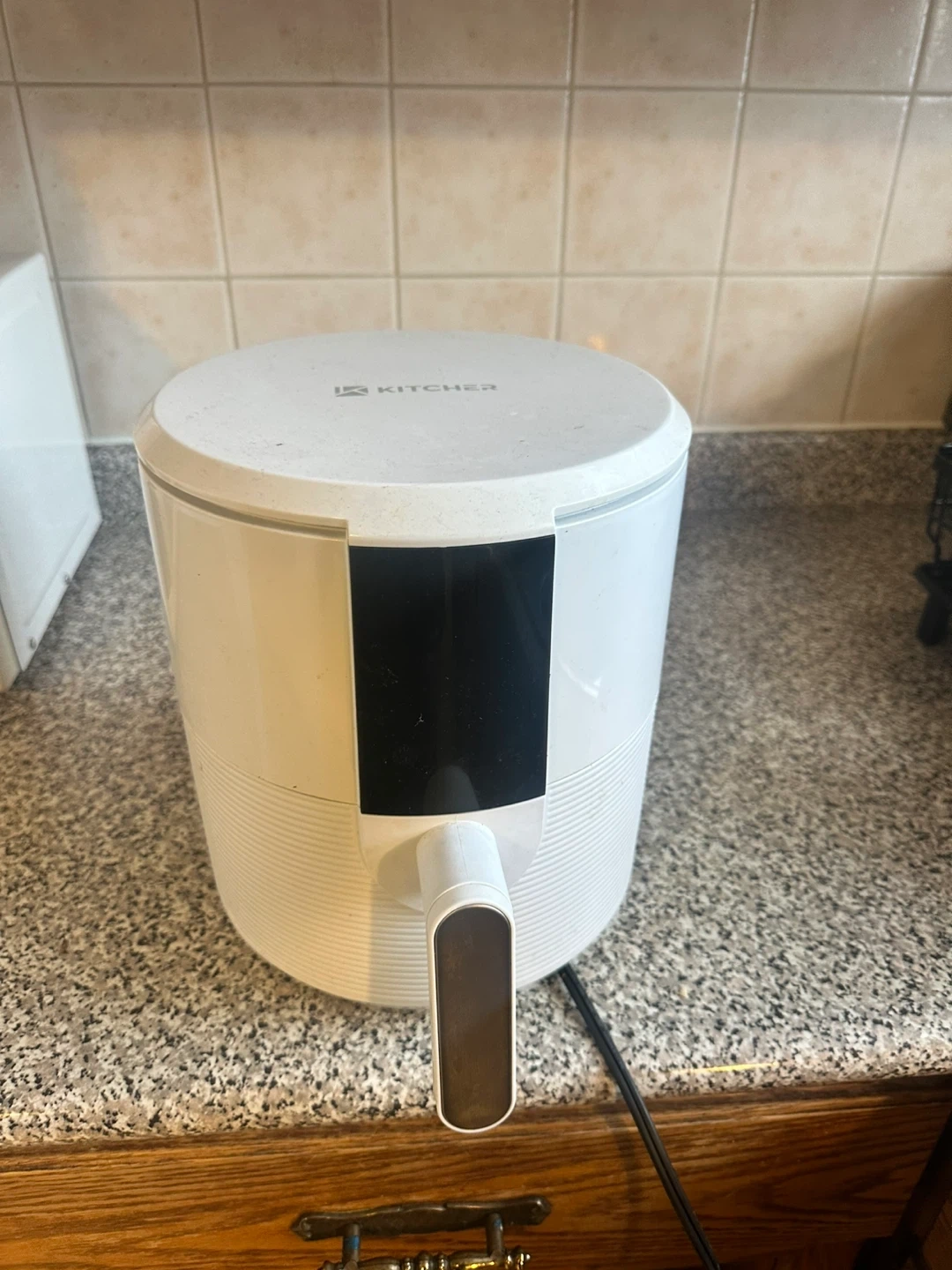 White KITCHER air fryer with a removable basket. It's a countertop appliance designed for quick cooking. Its compact size makes it suitable for smaller kitchens.