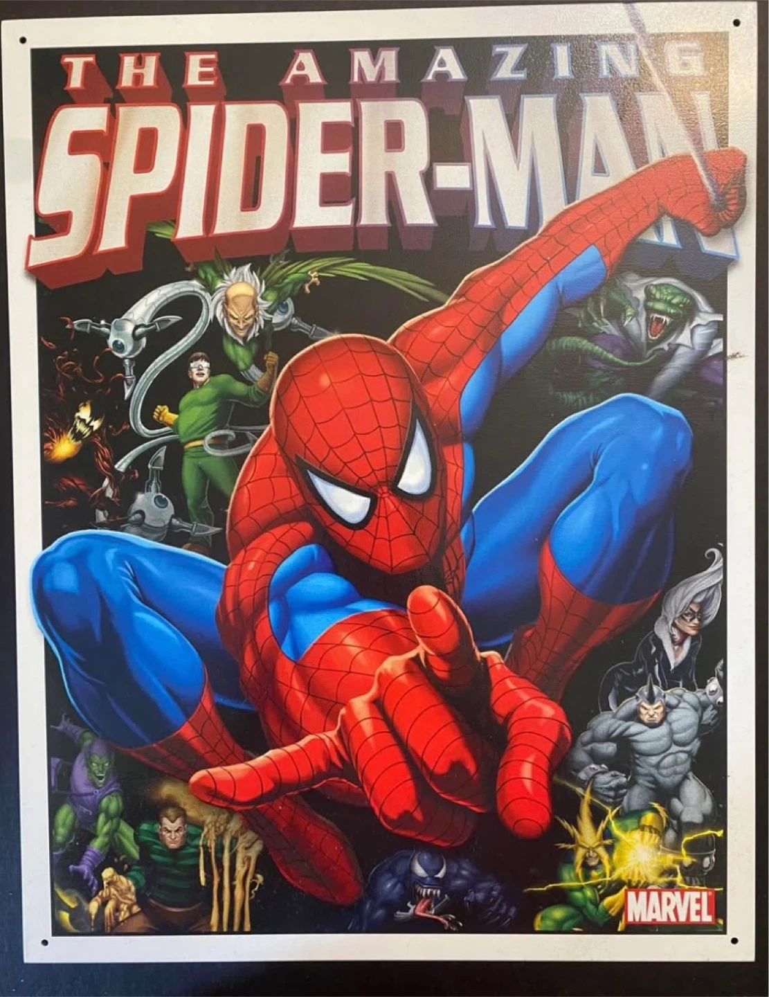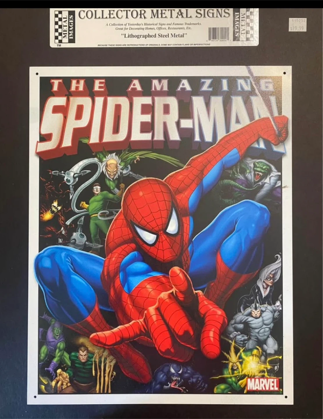 Metal Images collector metal sign featuring The Amazing Spider-Man comic cover. This sign is made of lithographed steel. It's a great piece for any Marvel fan's collection!