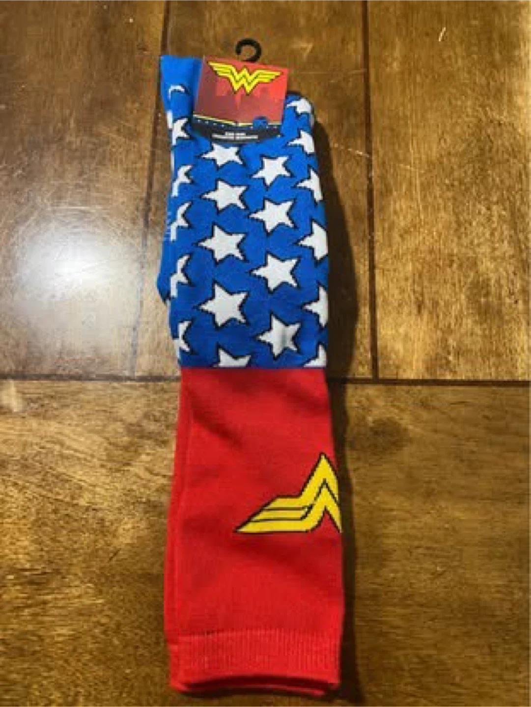 These are Wonder Woman socks featuring a blue background with white stars. The lower portion is red with the iconic Wonder Woman logo. They're perfect for any fan!