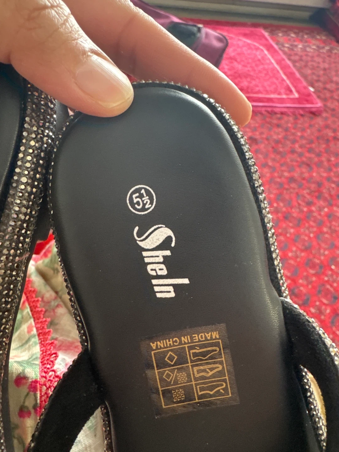 These black Shein flip flops are decorated with rhinestones along the straps. They're a size 5.5. The sole is black rubber.