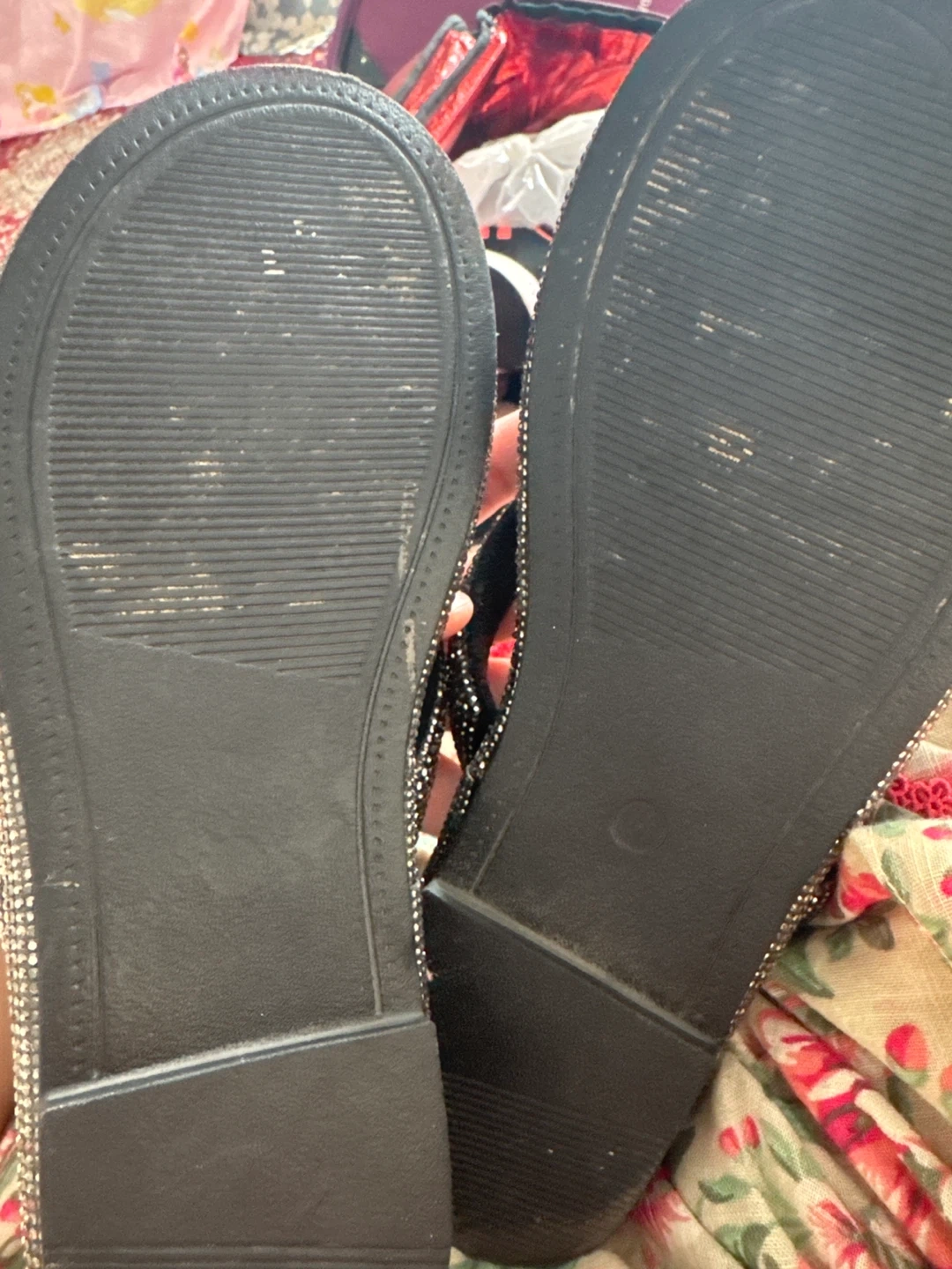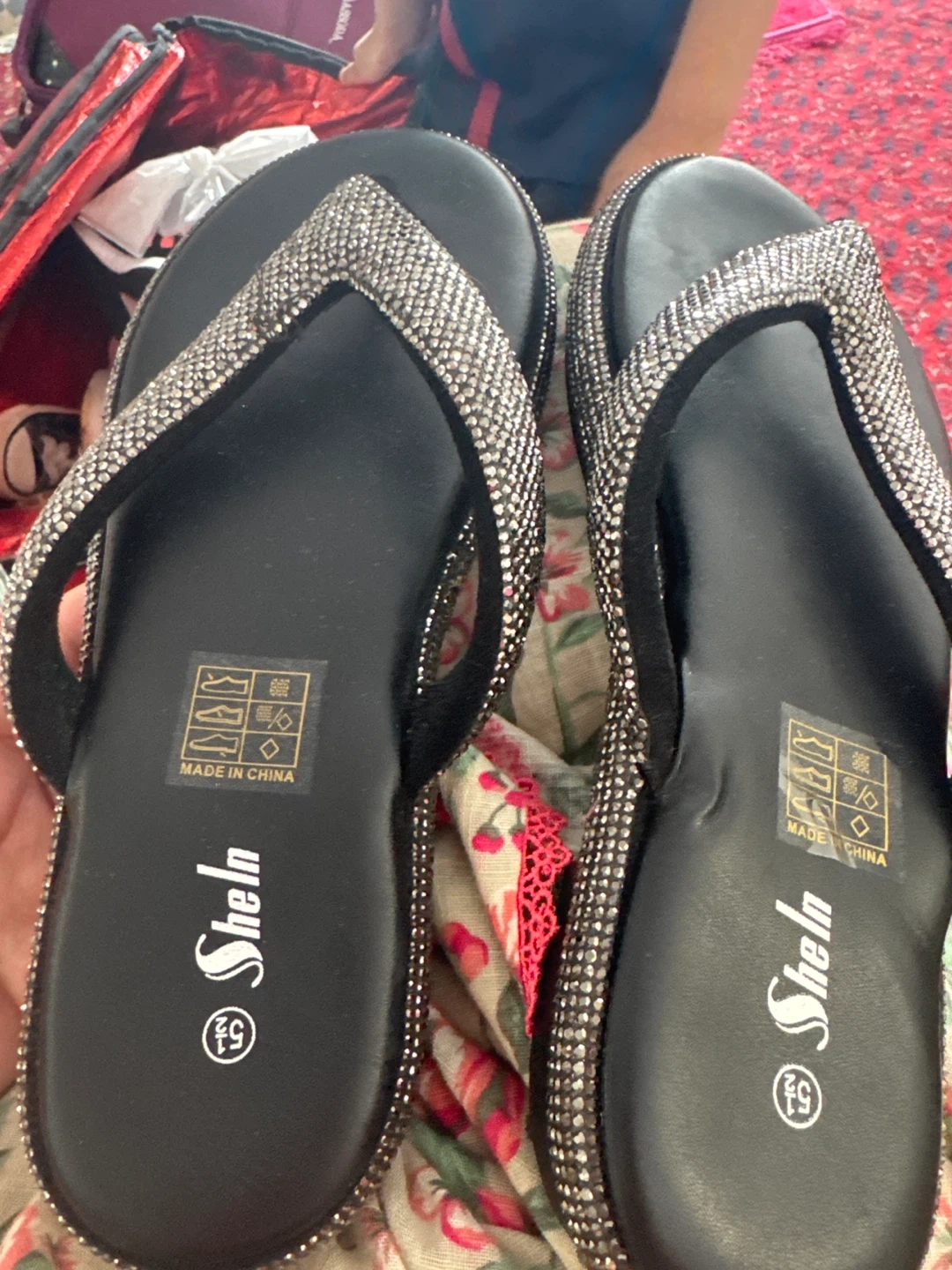 These black Shein flip flops are decorated with rhinestones along the straps. They're a size 5.5. The sole is black rubber.