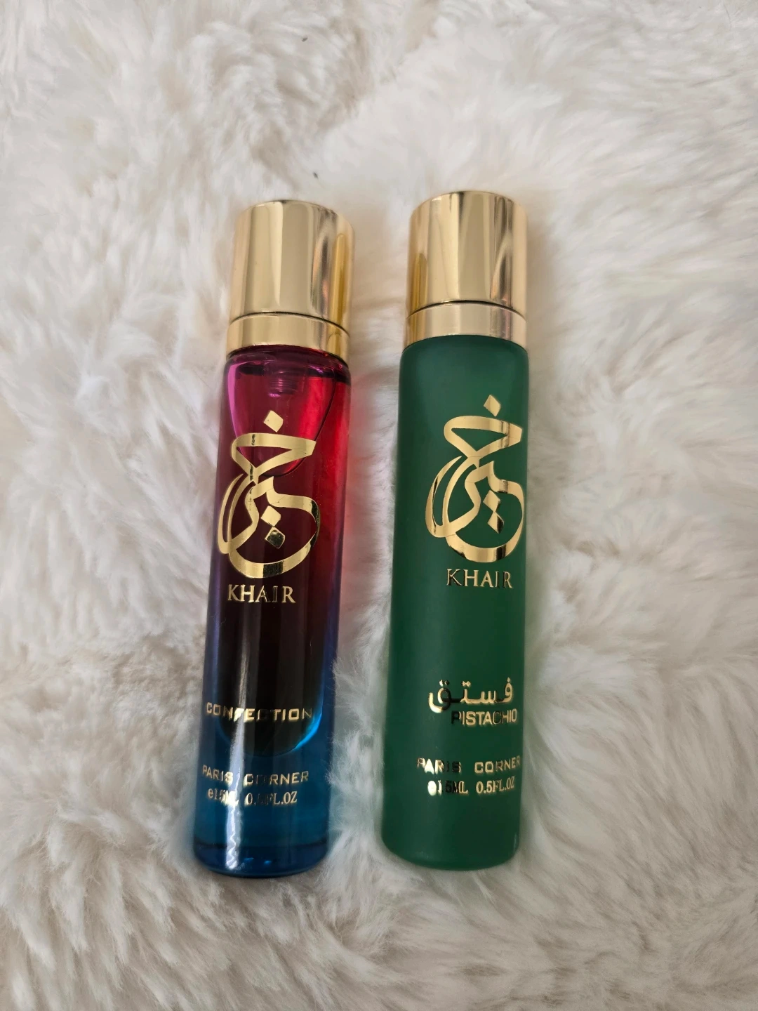 Three Khair perfumes, Fusion Confection and Pistachio. Each bottle is 15ml and 0.5 FL.OZ. They have gold caps. These are smaller sized. Great for those just trying out. Box available but it was a set that was split. Meet up or pick up only. Cash only. $25 for the set or $10 each individually.