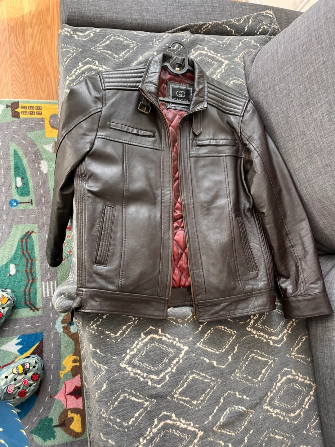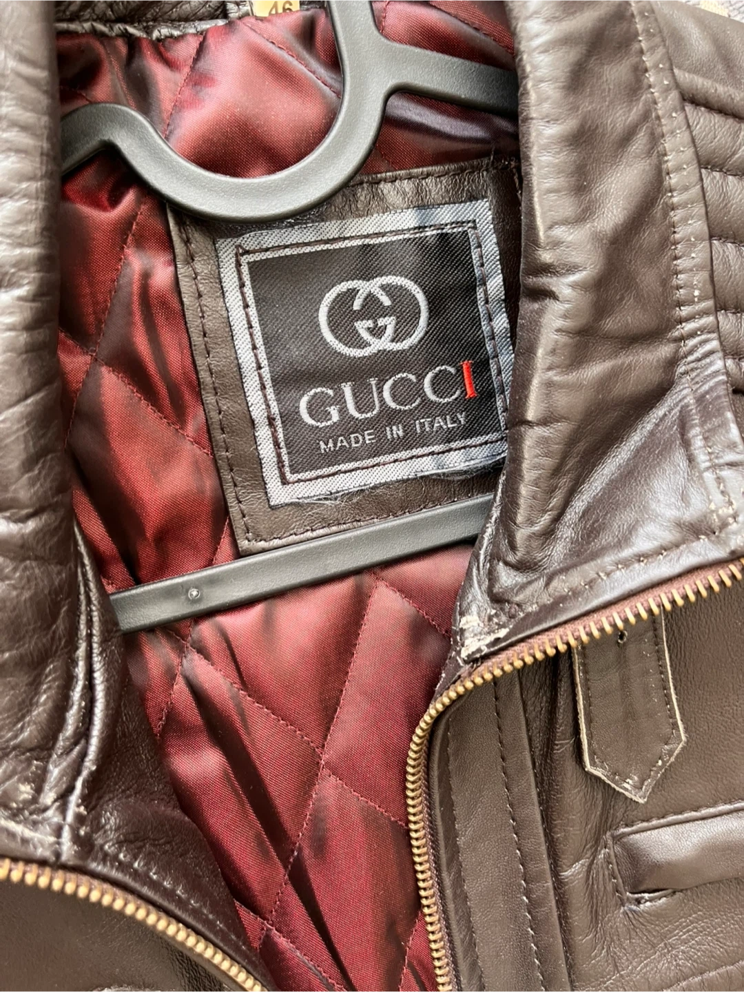This is a stylish men's brown leather jacket. It features a quilted red satin lining and a zipper closure. Gucci..Made in Italy.