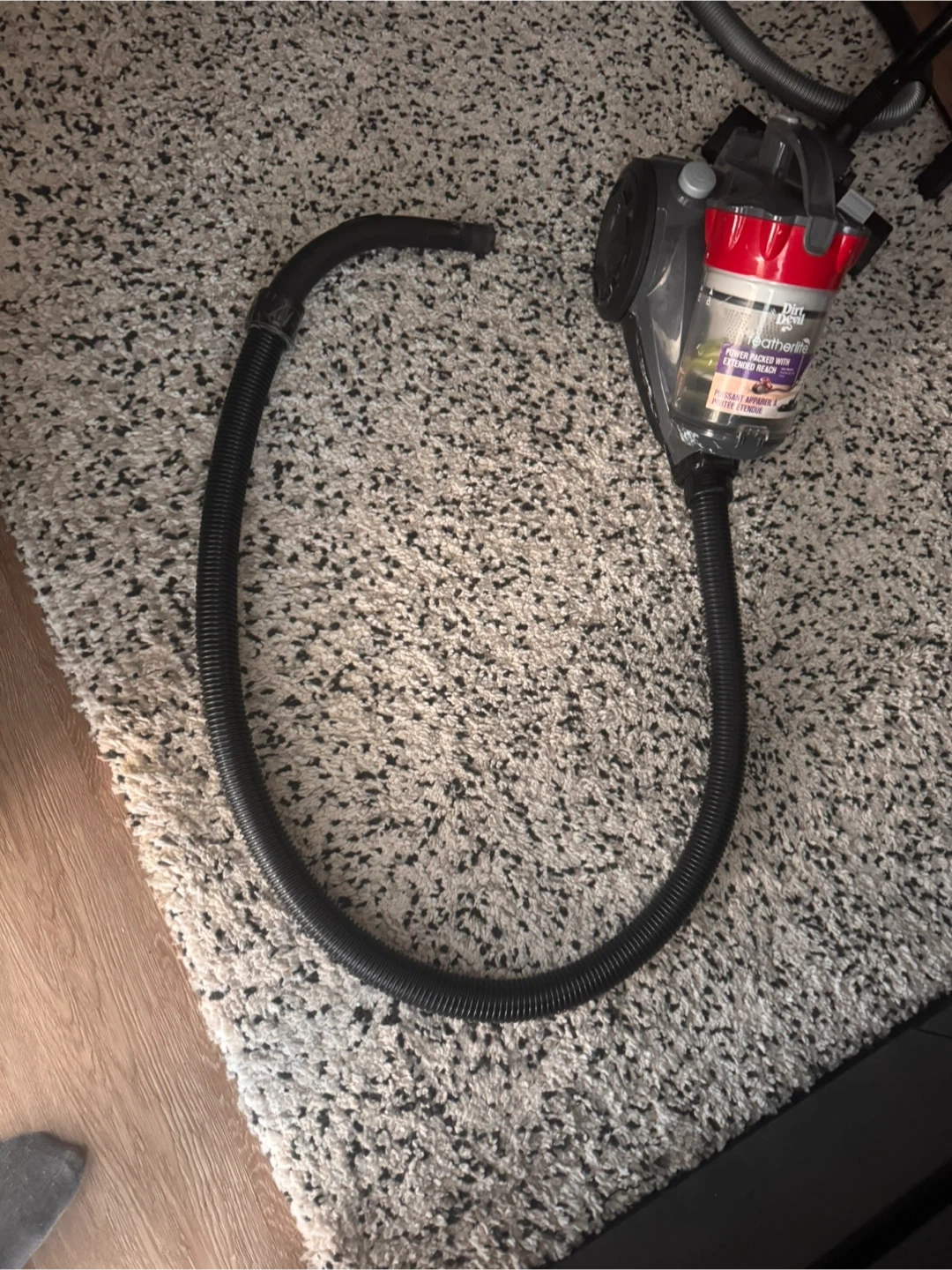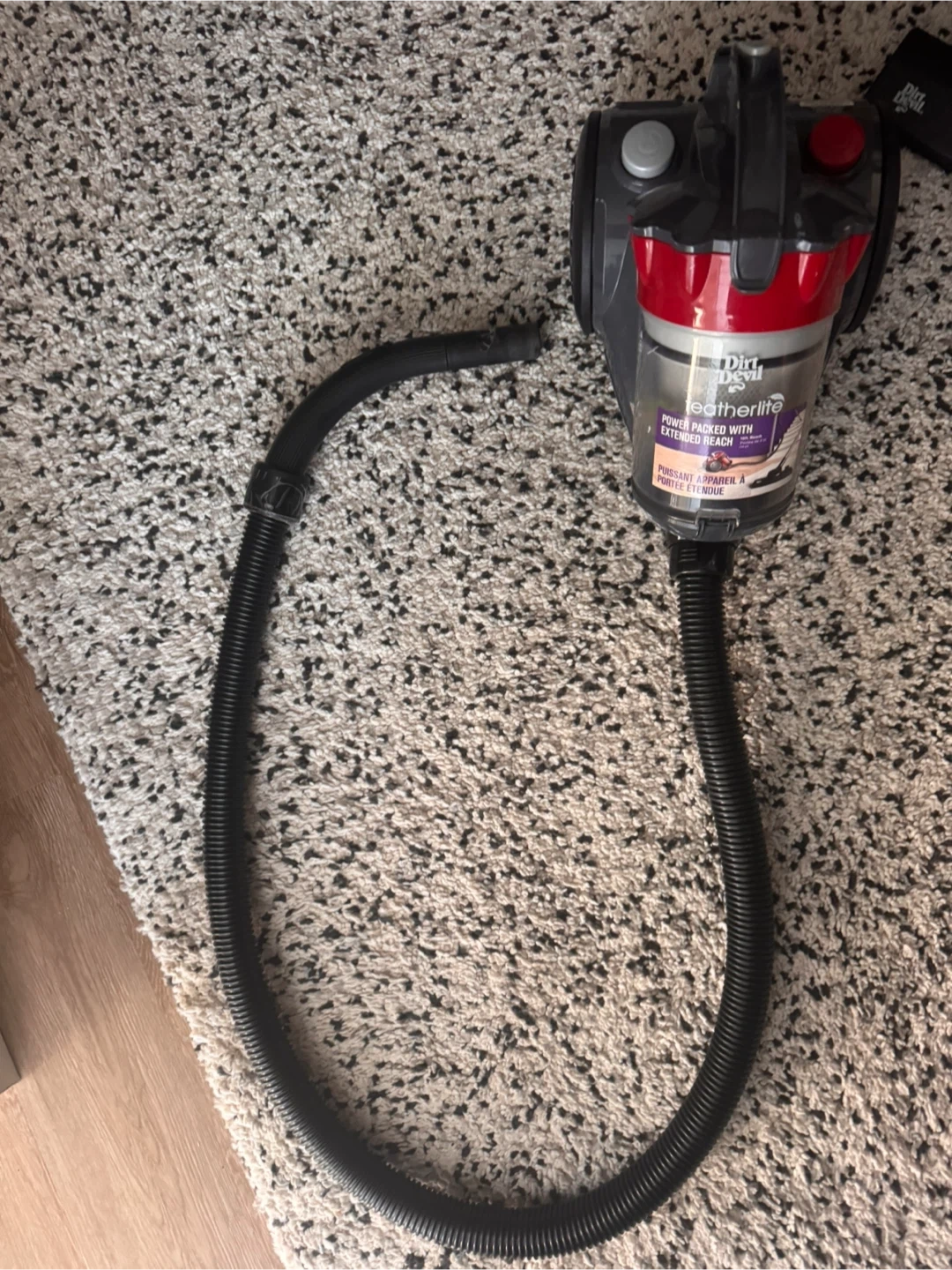 Dirt Devil Featherlite bagless vacuum cleaner in red and grey. Comes with a hose and wand attachment. Lightweight and easy to maneuver, making it ideal for quick cleanups around the house. The tube has a small crack that has been taped; however, a replacement tube is available on Amazon for about $4. The vacuum works perfectly.