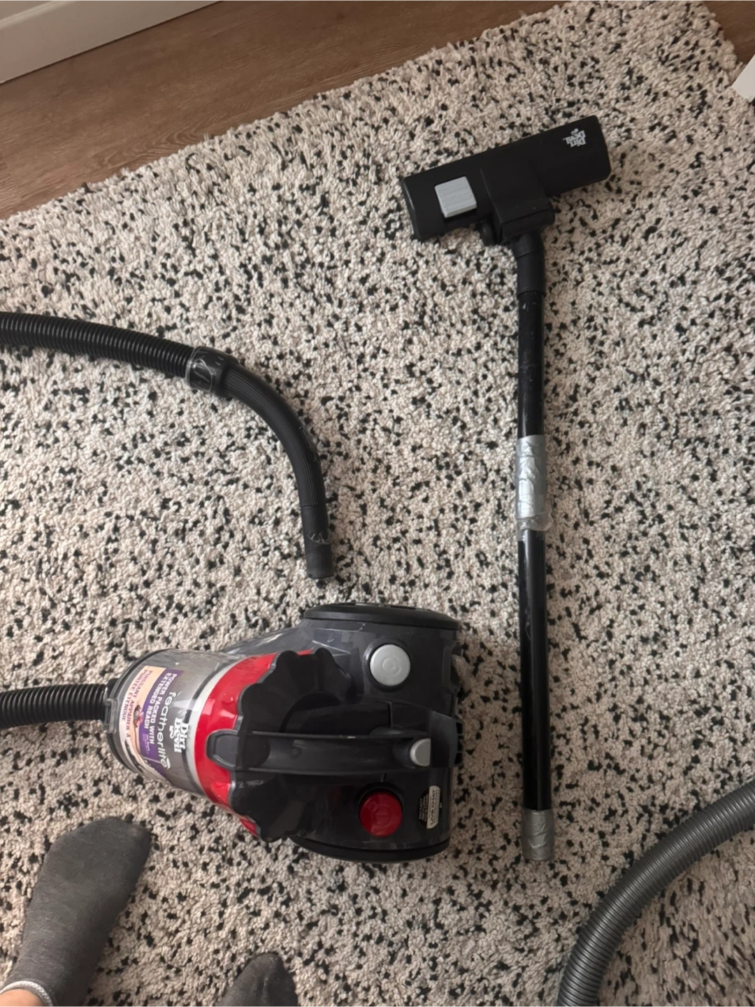 Dirt Devil Featherlite bagless vacuum cleaner in red and grey. Comes with a hose and wand attachment. Lightweight and easy to maneuver, making it ideal for quick cleanups around the house. The tube has a small crack that has been taped; however, a replacement tube is available on Amazon for about $4. The vacuum works perfectly.