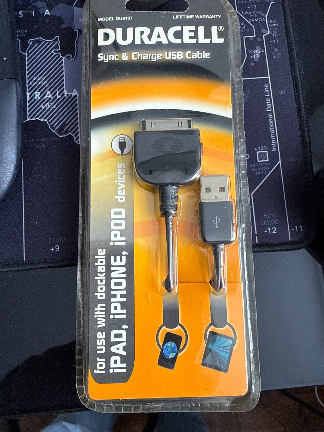 This Duracell sync and charge USB cable is designed for use with dockable iPad, iPhone, and iPod devices. It's a model DU6107 cable. This cable allows you to sync your device data and charge it simultaneously. A great accessory for Apple users!
