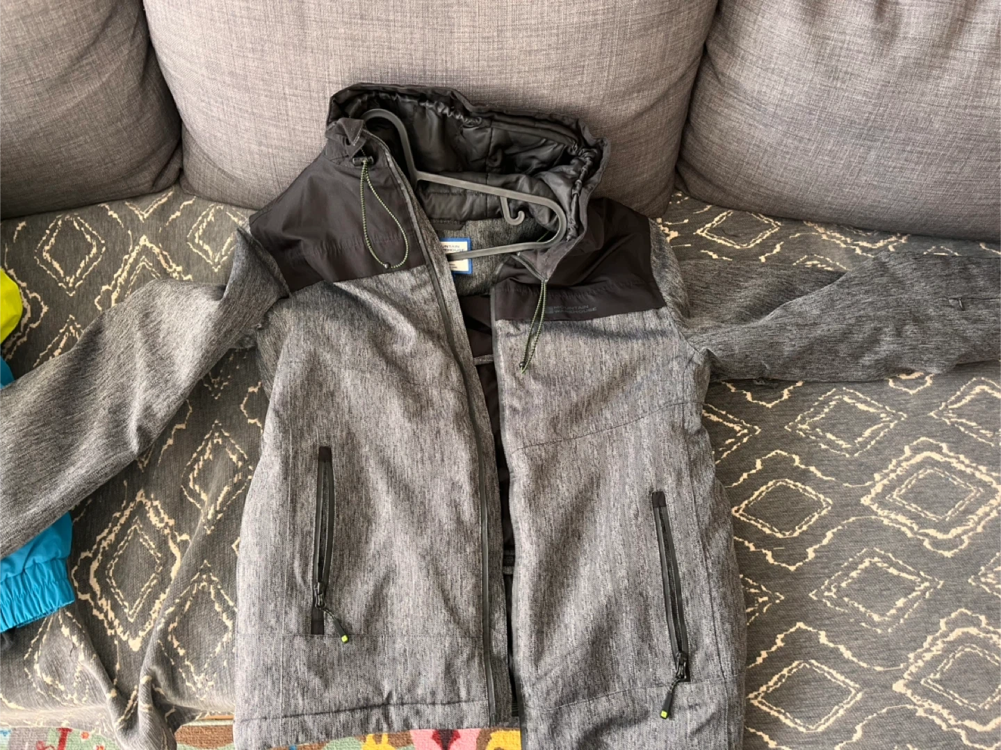 This Mountain Warehouse jacket is designed for snow activities. It features a grey heathered exterior with black accents and a full zip closure. Zippered pockets offer secure storage. It's built for warmth and protection in cooler weather!