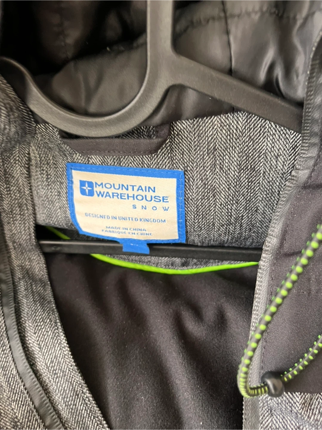 This Mountain Warehouse jacket is designed for snow activities. It features a grey heathered exterior with black accents and a full zip closure. Zippered pockets offer secure storage. It's built for warmth and protection in cooler weather!