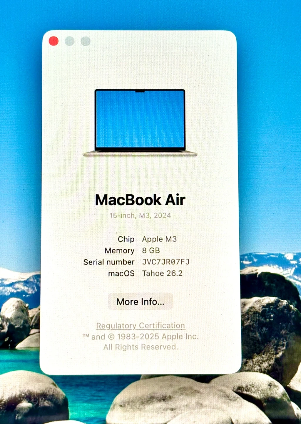 Apple MacBook Air M3 15” 256 gig, 2024, used very rarely like new! Battery at 97%. Not a mark on this unit. Comes with a new padded carrying bag with storage & charger. Text if interested: Tyler 780-707-3927
