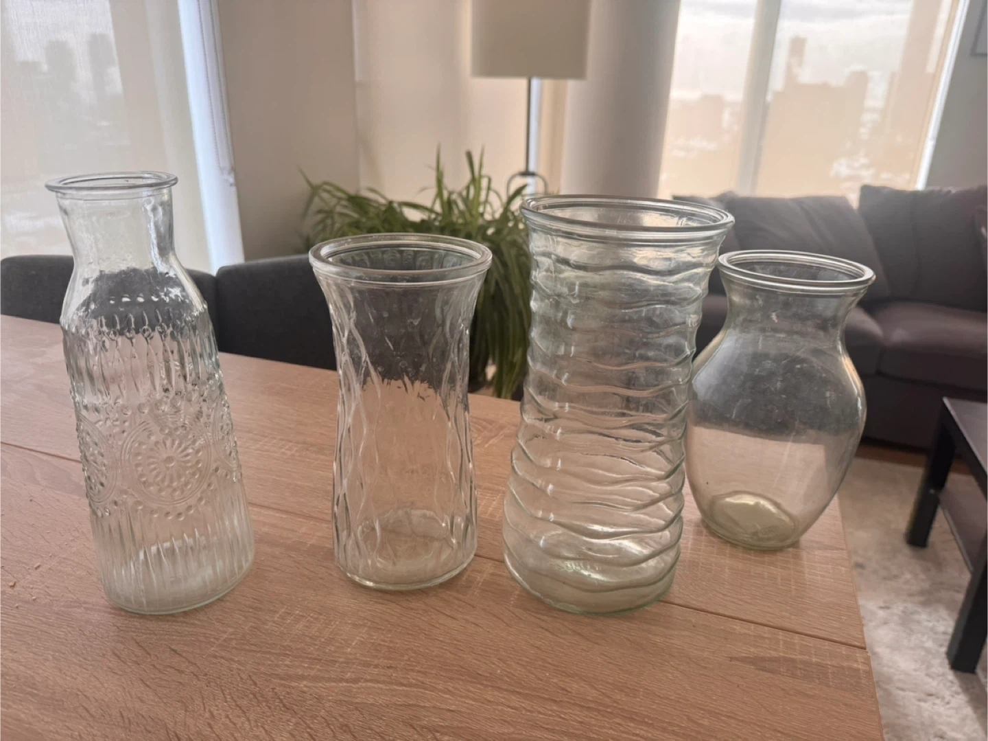 This is a set of four clear glass vases. They come in various decorative styles, including one with a patterned texture and three with ribbed or wavy designs. Glass material. Great for adding a touch of simple decor!Each $ 1