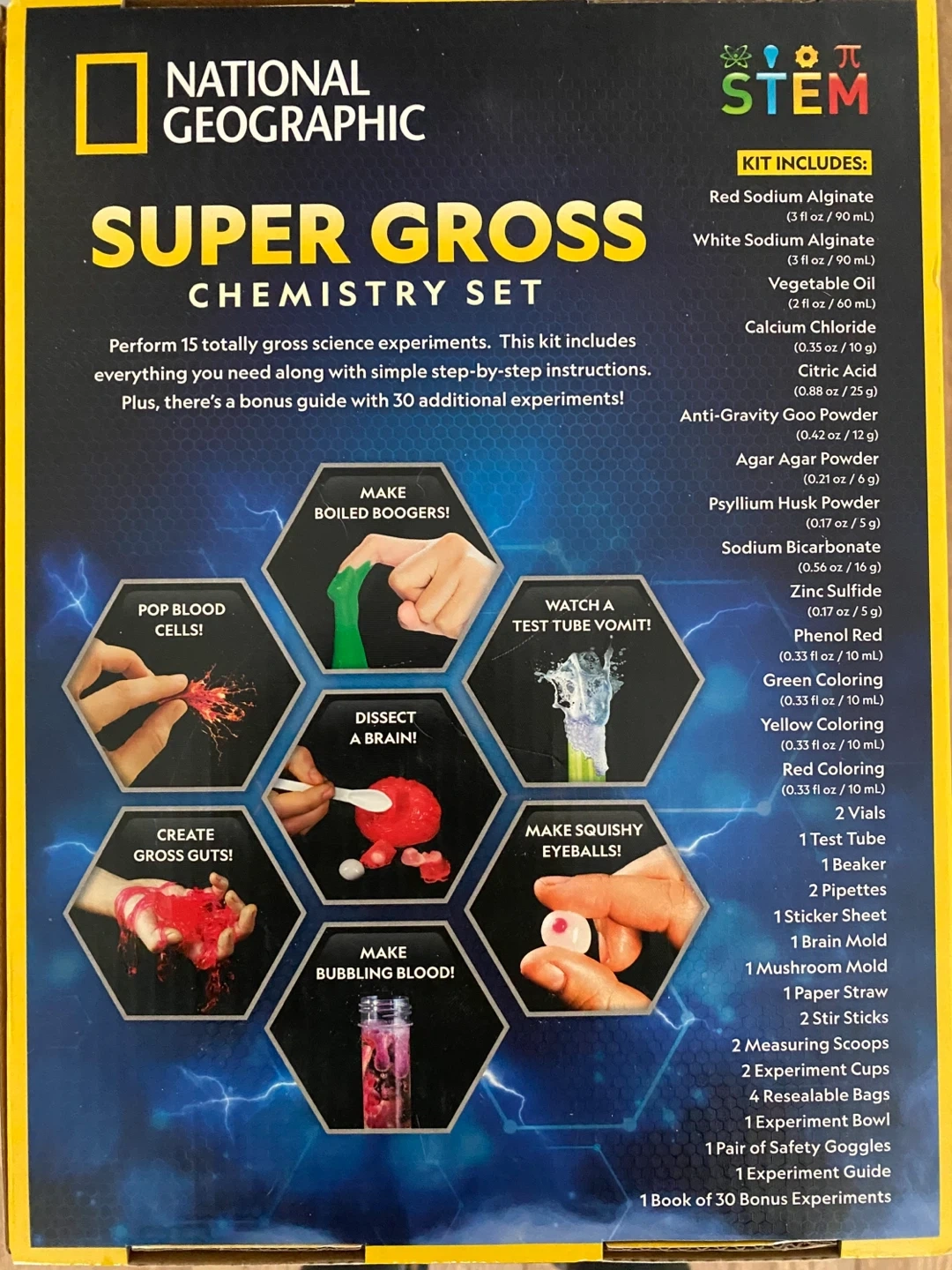 Perform 15 totally gross science experiments with this National Geographic chemistry set. It includes all the necessary ingredients and instructions for 15 experiments, plus a bonus guide for 30 more. It's a fun way to learn!