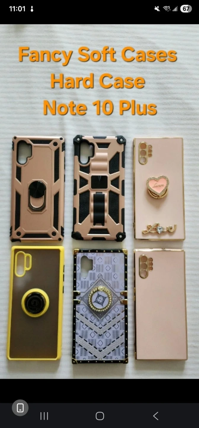 A variety of stylish phone cases designed for the Samsung Note 10 Plus. Includes rugged protective cases with kickstands and ring holders, as well as decorative options with 'love' accents. Available in rose gold, brown and yellow.