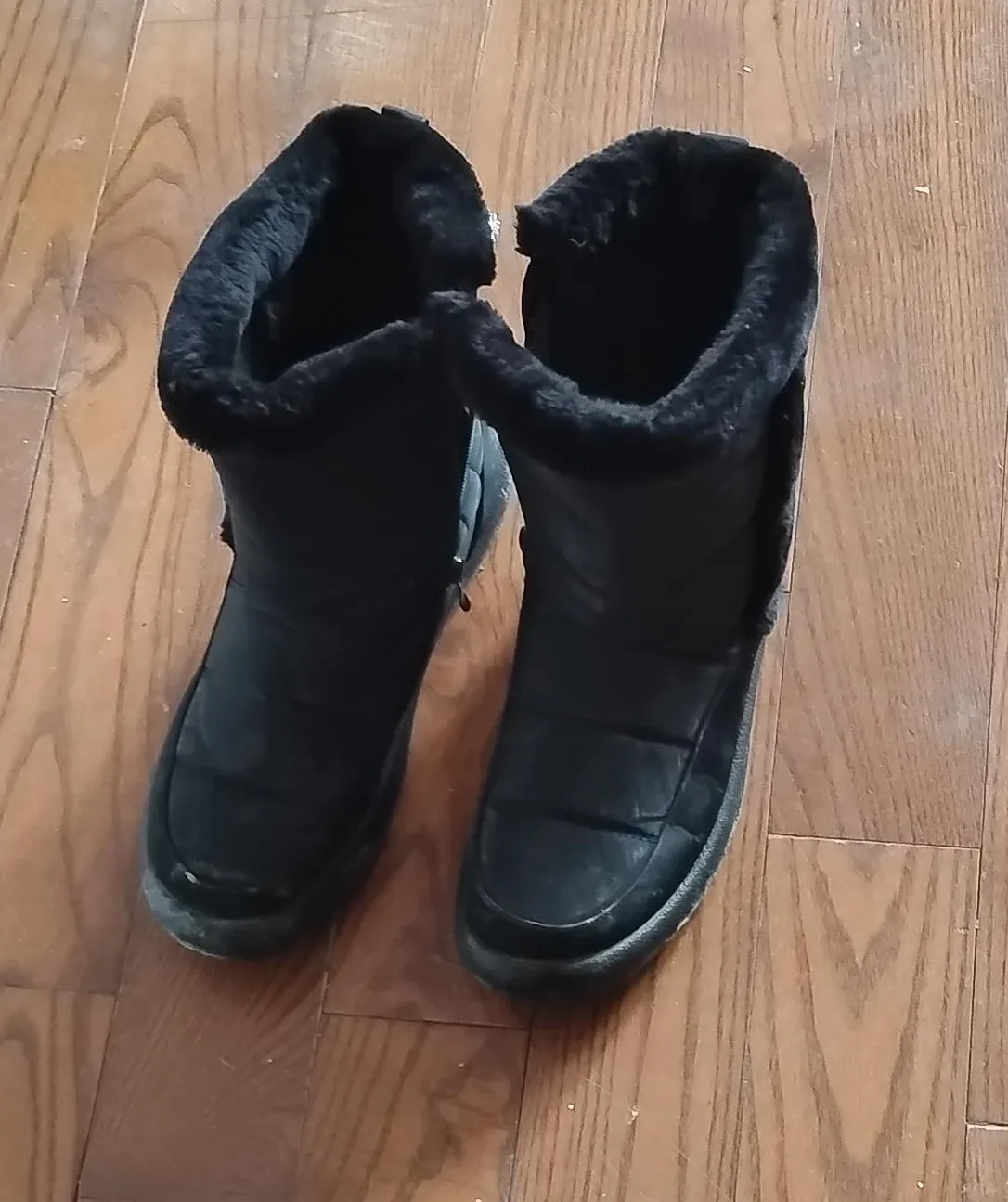 Warm black winter boots with a faux fur lining. These boots are designed for comfort and warmth during colder months. They're water-resistant and have a non-slip sole.