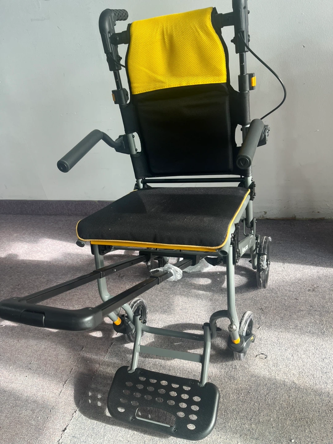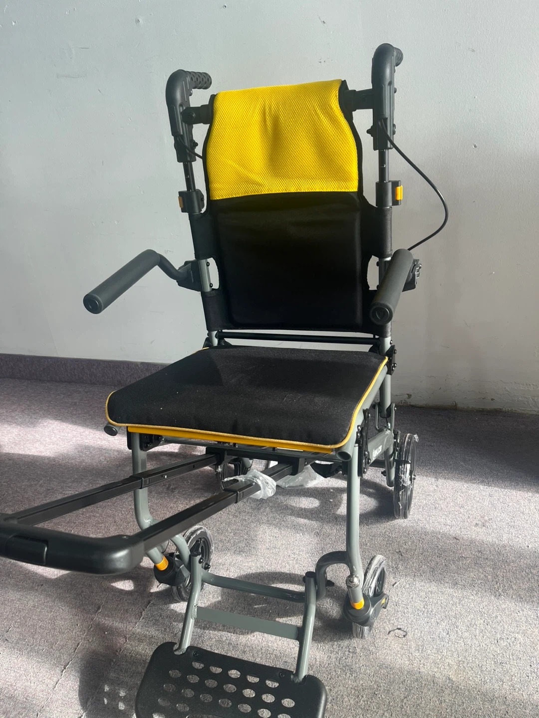 This is a lightweight folding wheelchair with a yellow padded backrest and black seat. It includes armrests and a footrest. The wheelchair is designed for easy transport and storage. It's great for individuals who need mobility assistance for appointments or outings. Actual price is $250 plus taxes on amazon.