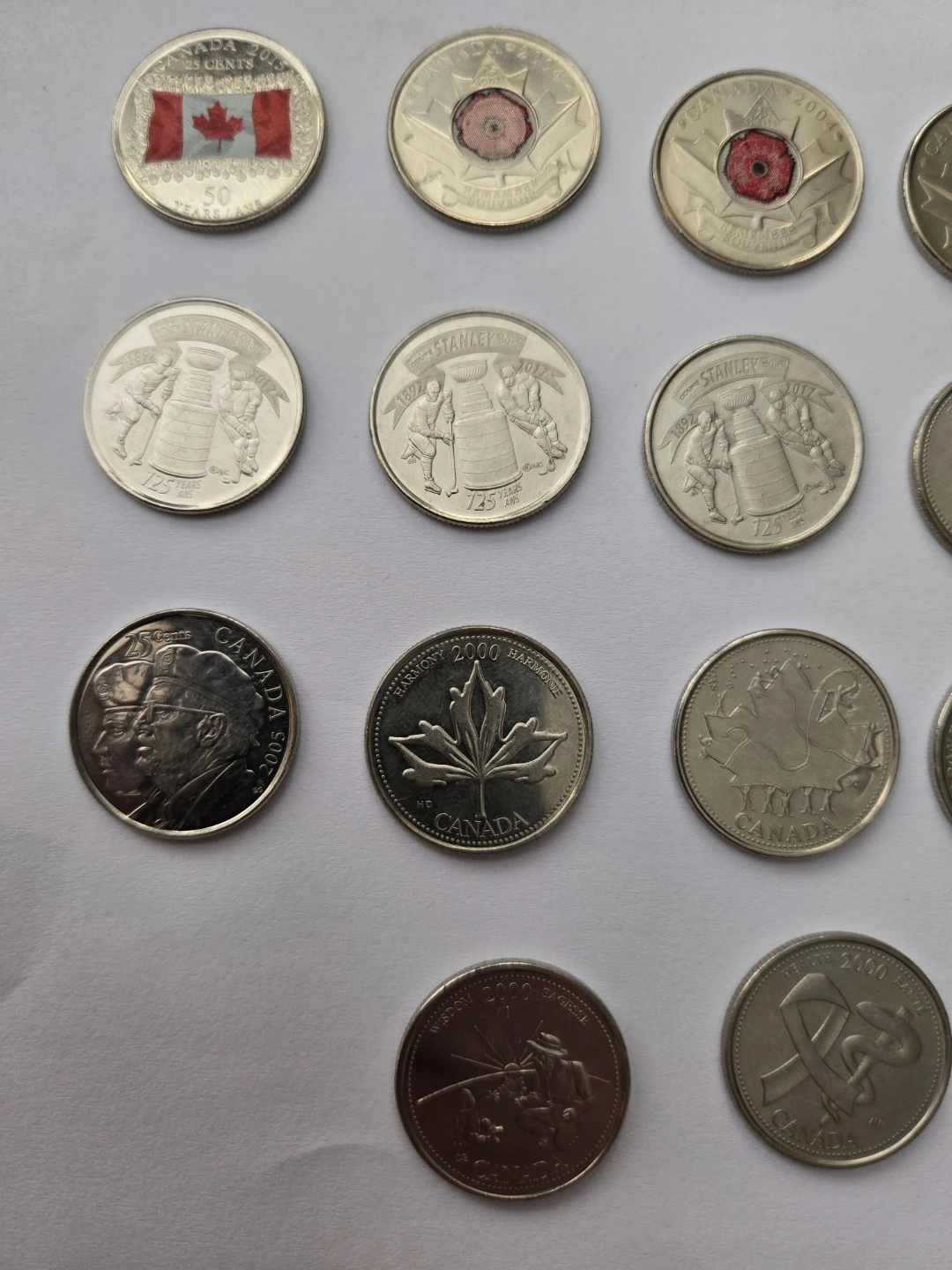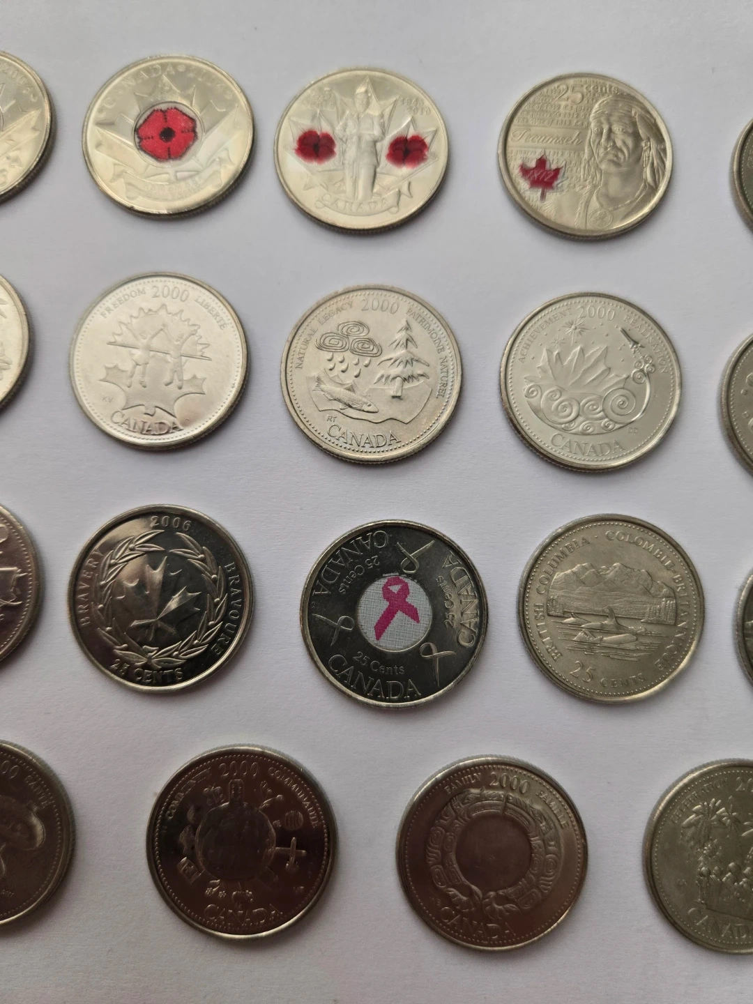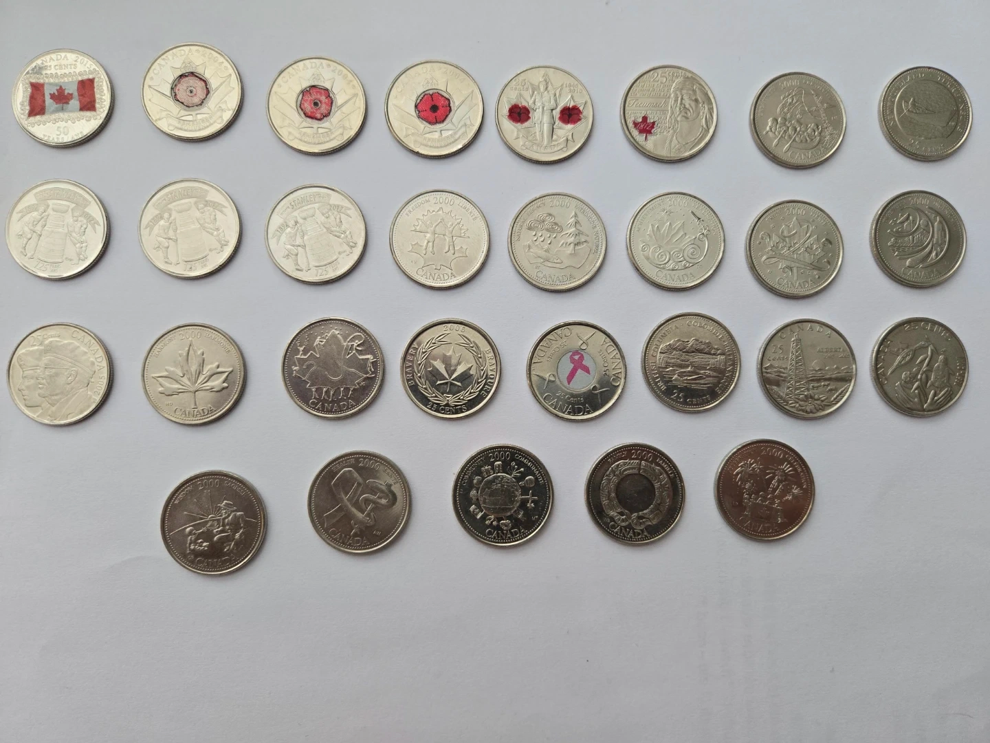 29 Commemorative Canadian quarters. Includes special editions like the Stanley Cup, Remembrance Day poppies, and breast cancer awareness designs.