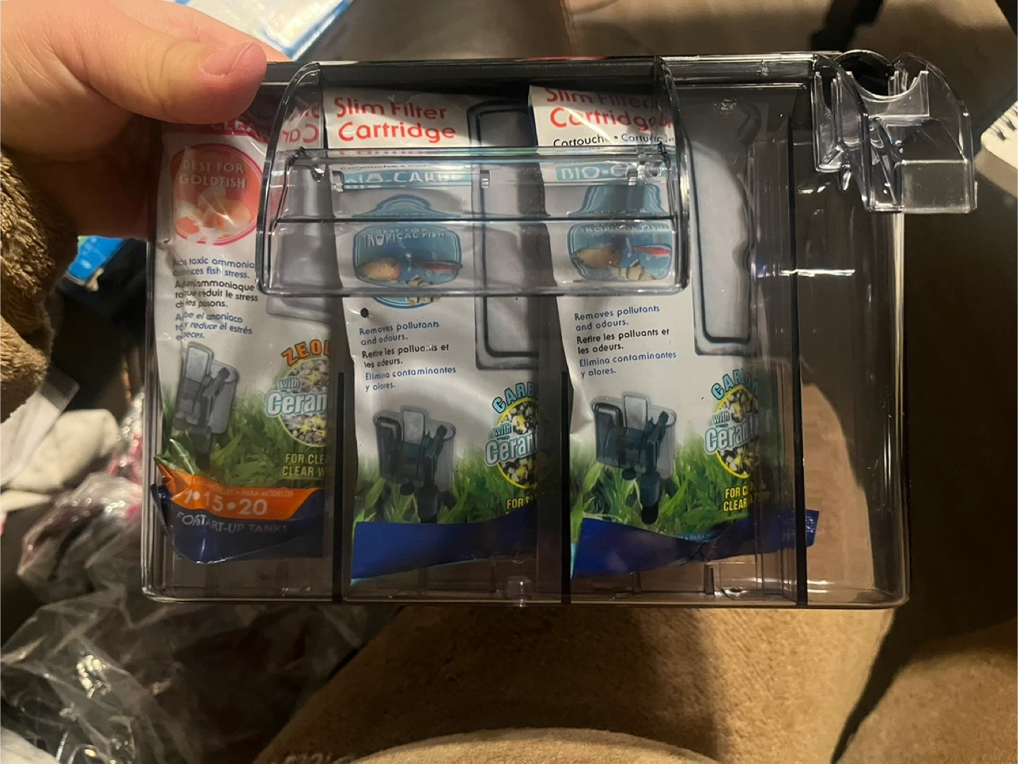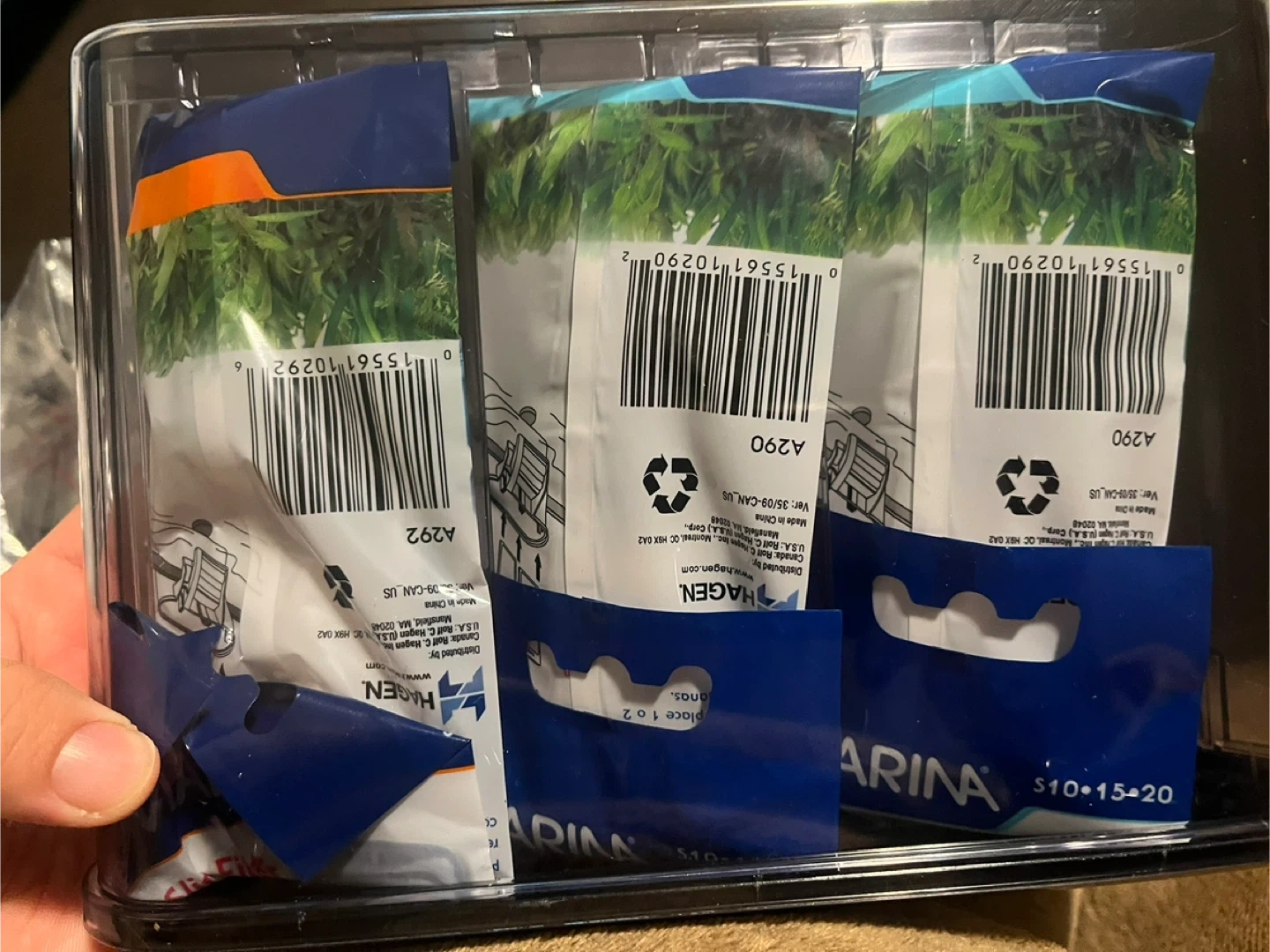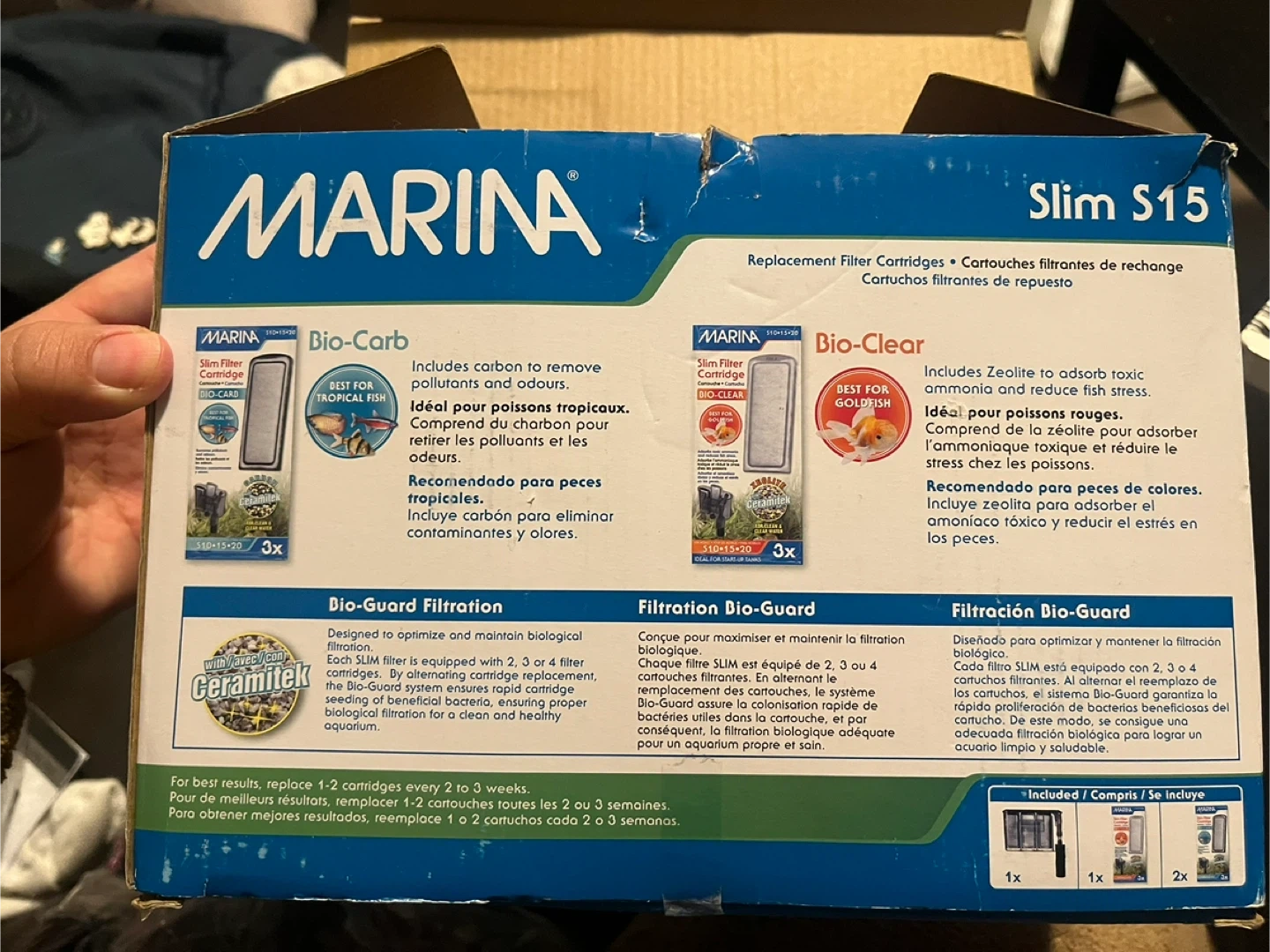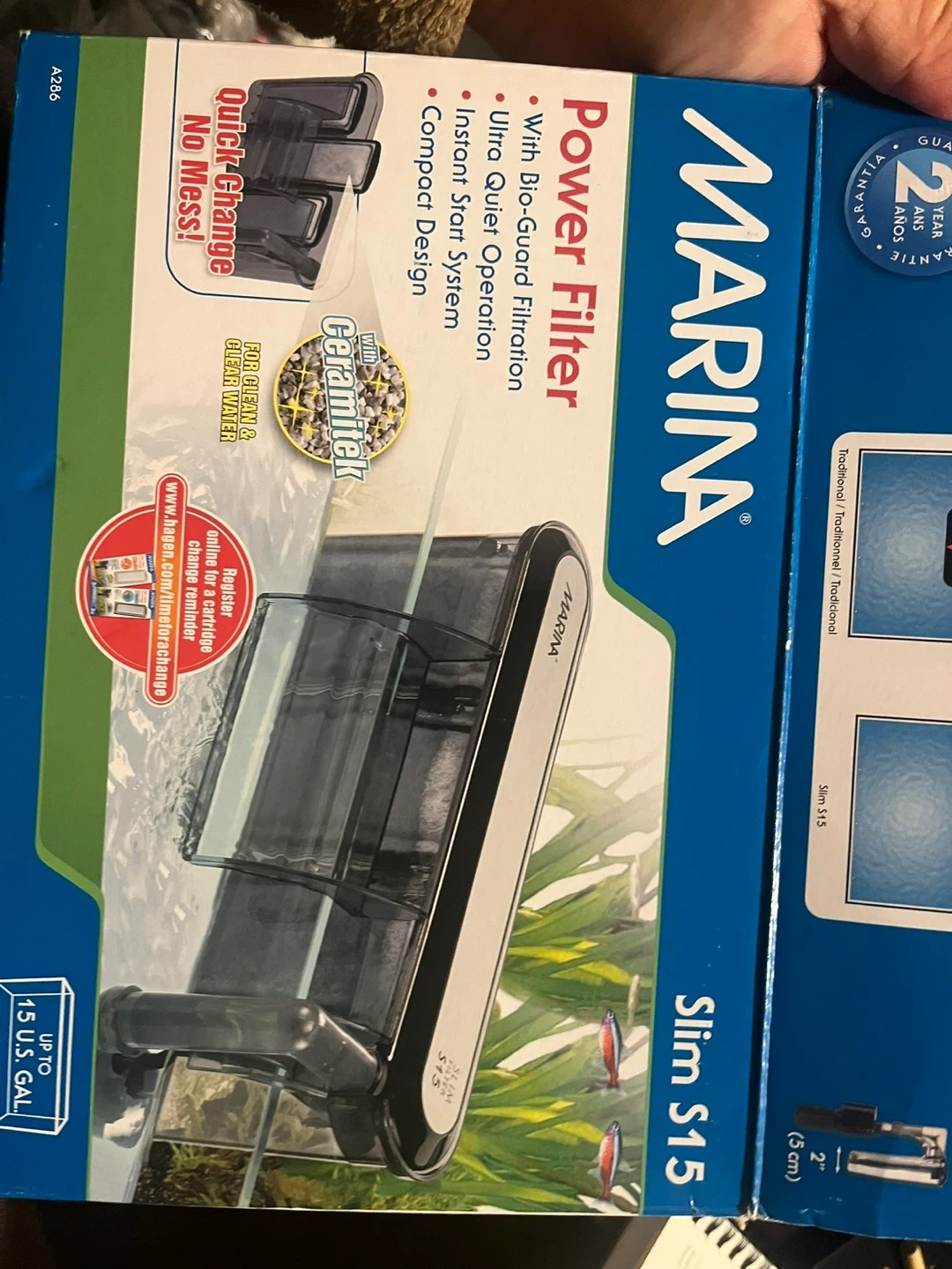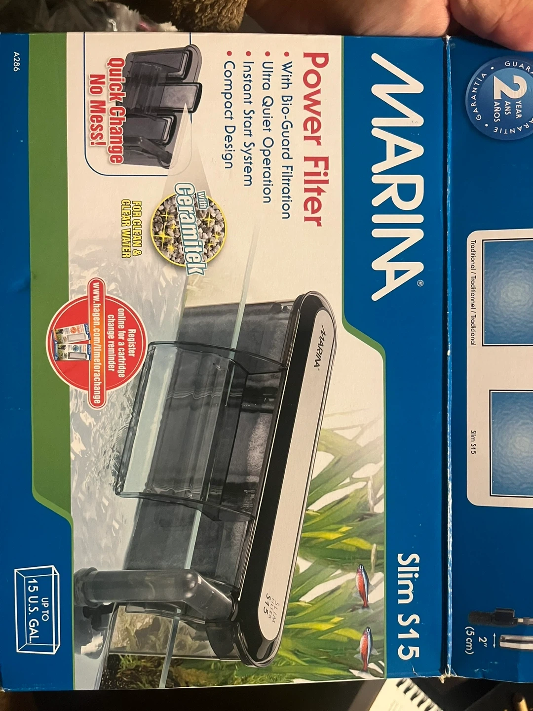 Marina S15 power filter for aquariums. It features bio-guard filtration, ultra quiet operation, and a compact design. Includes original box and filter cartridges.