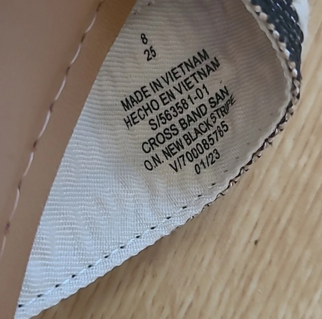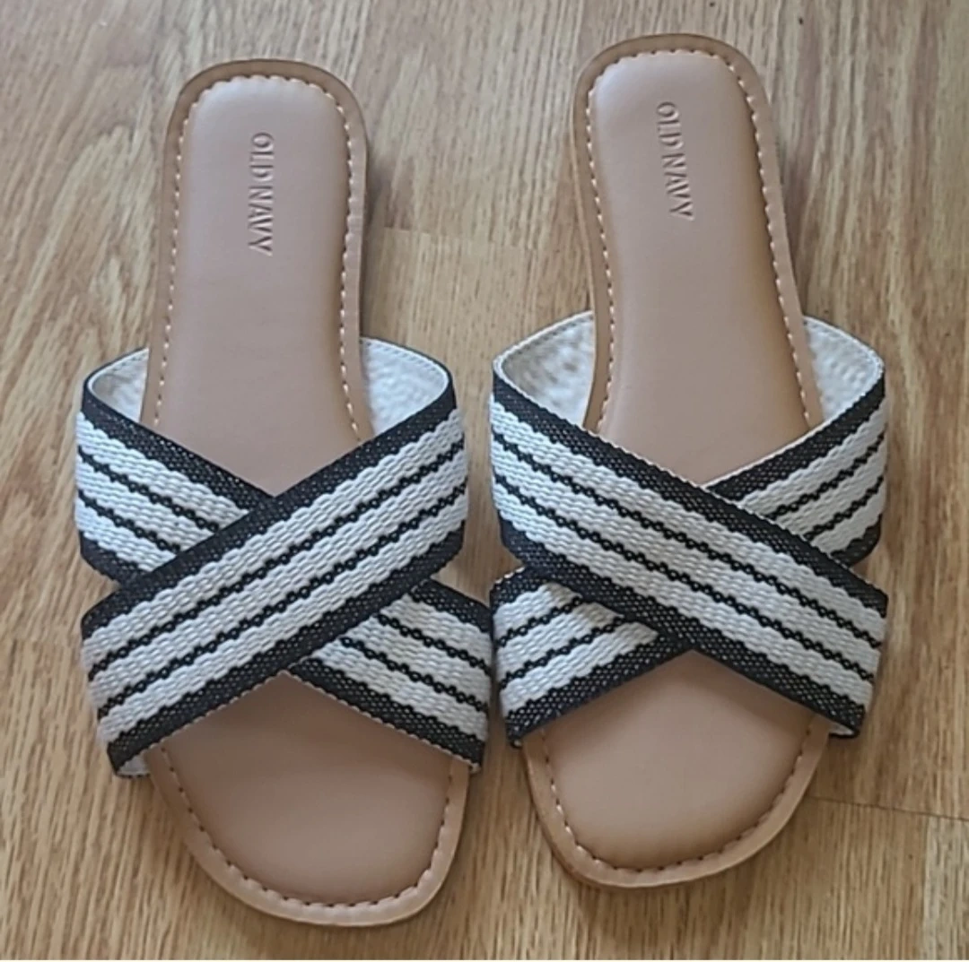 Brand new Old Navy women's slip-on sandals, featuring a cross-band design with black and white stripes. Size is 8.