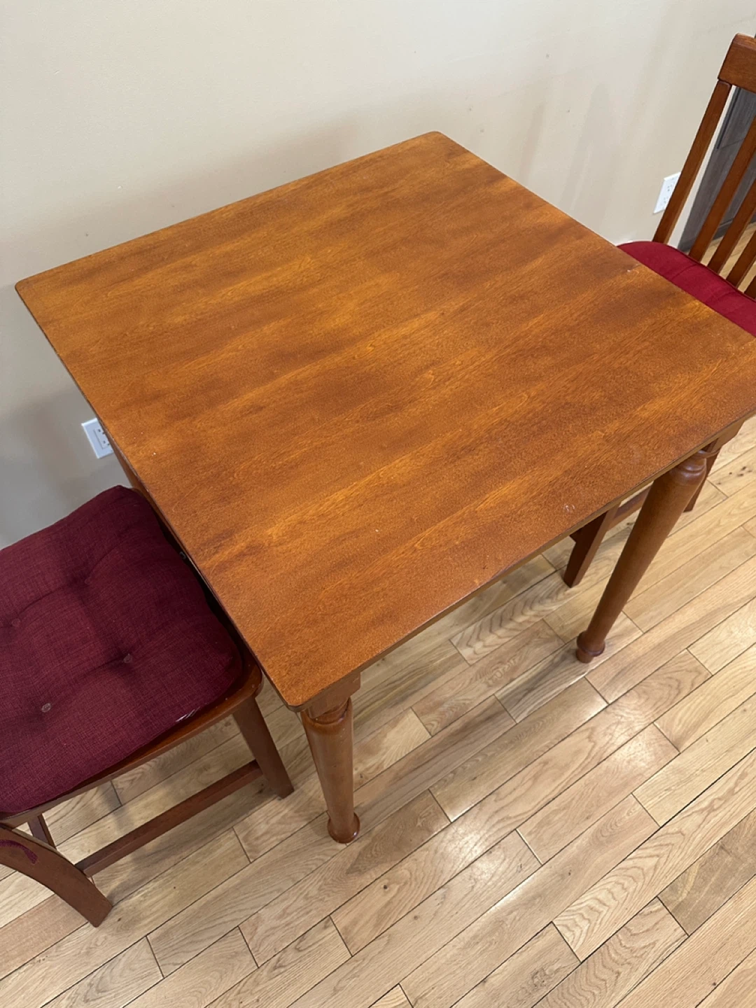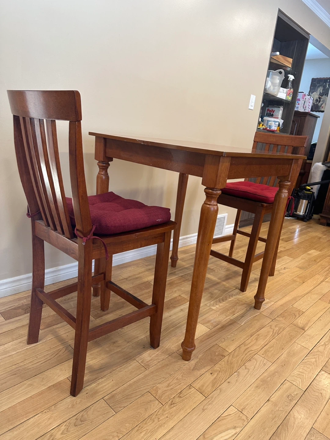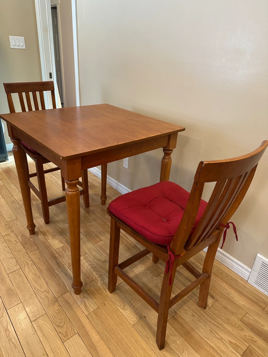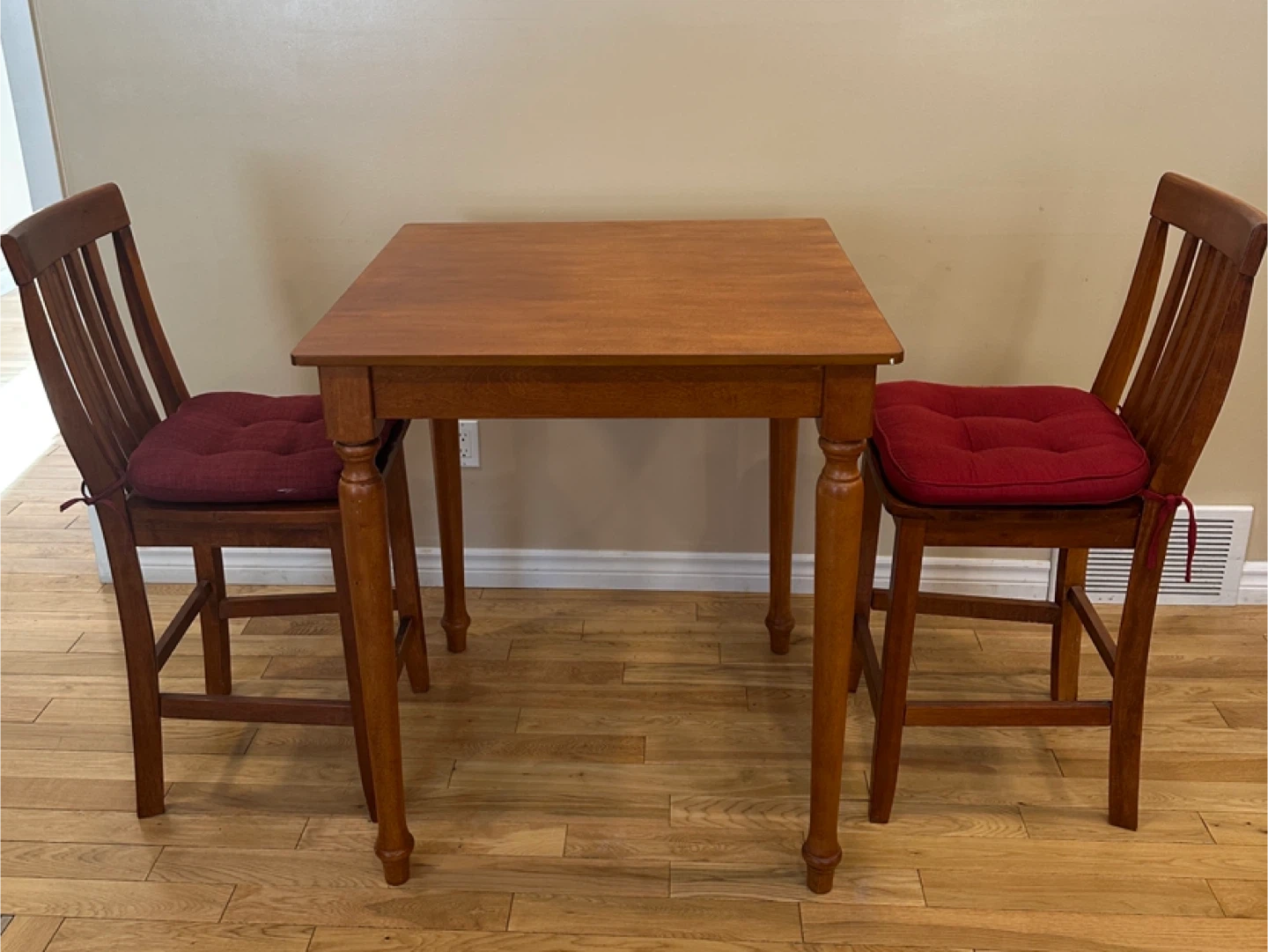 Square counter-height dining table with two matching chairs. Made of solid wood with a warm honey-toned finish. Sturdy, compact, and perfect for small kitchens, condos, or breakfast nooks.