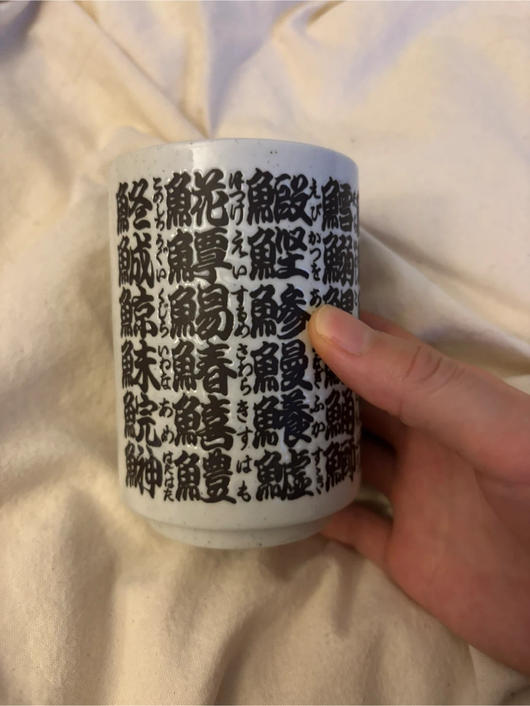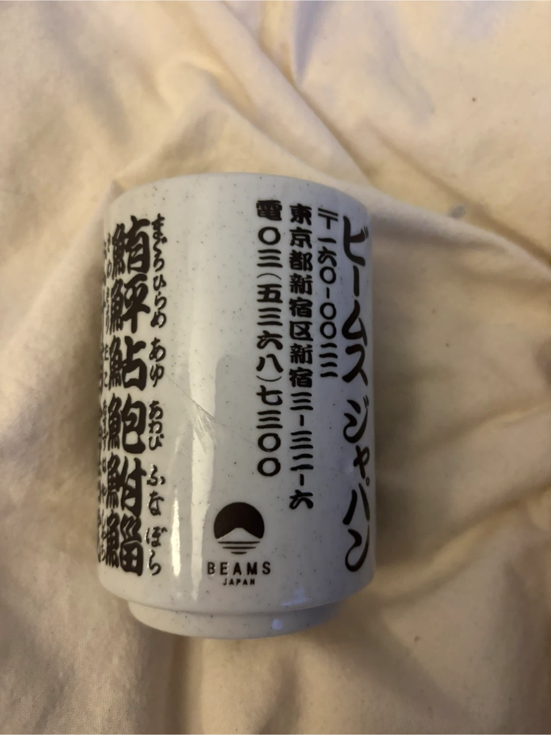 This ceramic cup features "BEAMS JAPAN" branding and is made in Japan. It has Japanese text design and a small crack near the middle. The cup is white with black lettering.