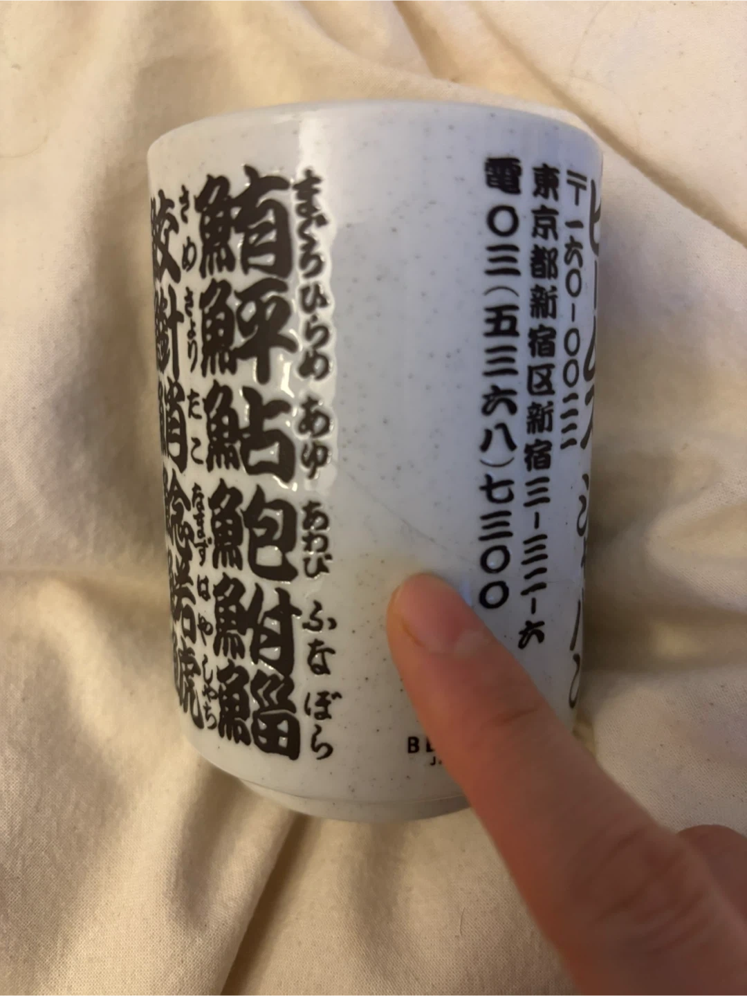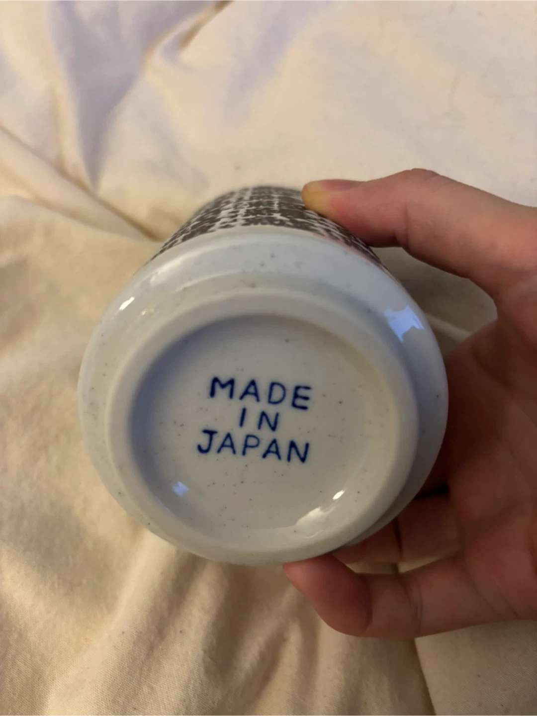 This ceramic cup features "BEAMS JAPAN" branding and is made in Japan. It has Japanese text design and a small crack near the middle. The cup is white with black lettering.