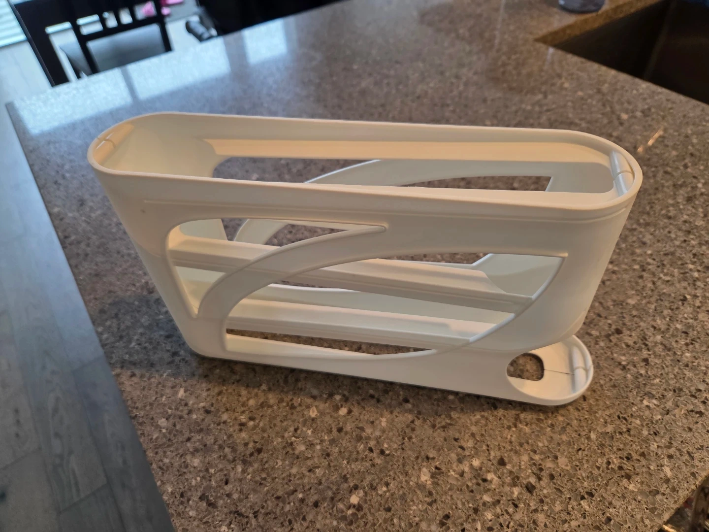 This white egg organizer rack is made of plastic. It holds up to 30 eggs and measures 12.9 inches long, 7 inches wide, and 7.8 inches tall. It's great for keeping your fridge tidy!