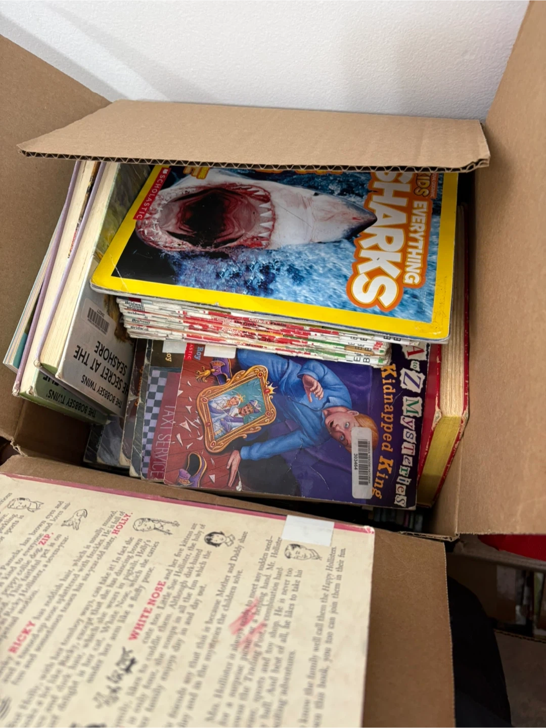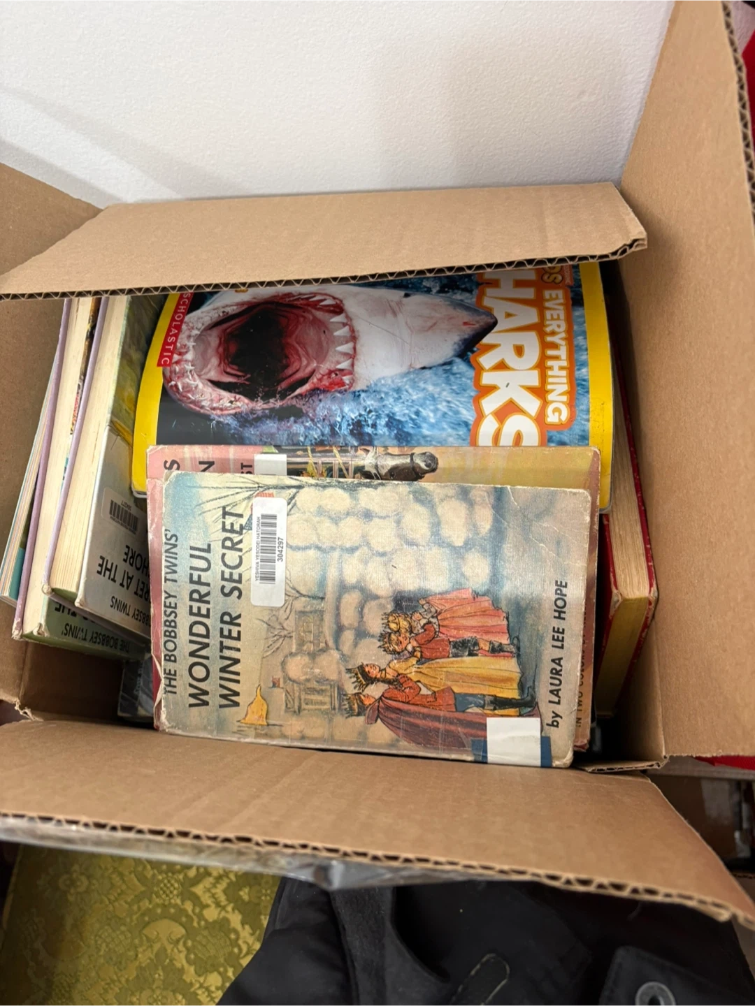 A collection of children's books including titles like 'SHARKS: EVERYTHING YOU NEED TO KNOW' and 'THE BOBSEY TWINS WONDERFUL WINTER SECRET'. These books are suitable for young readers. They're in a box, ready for a new home.