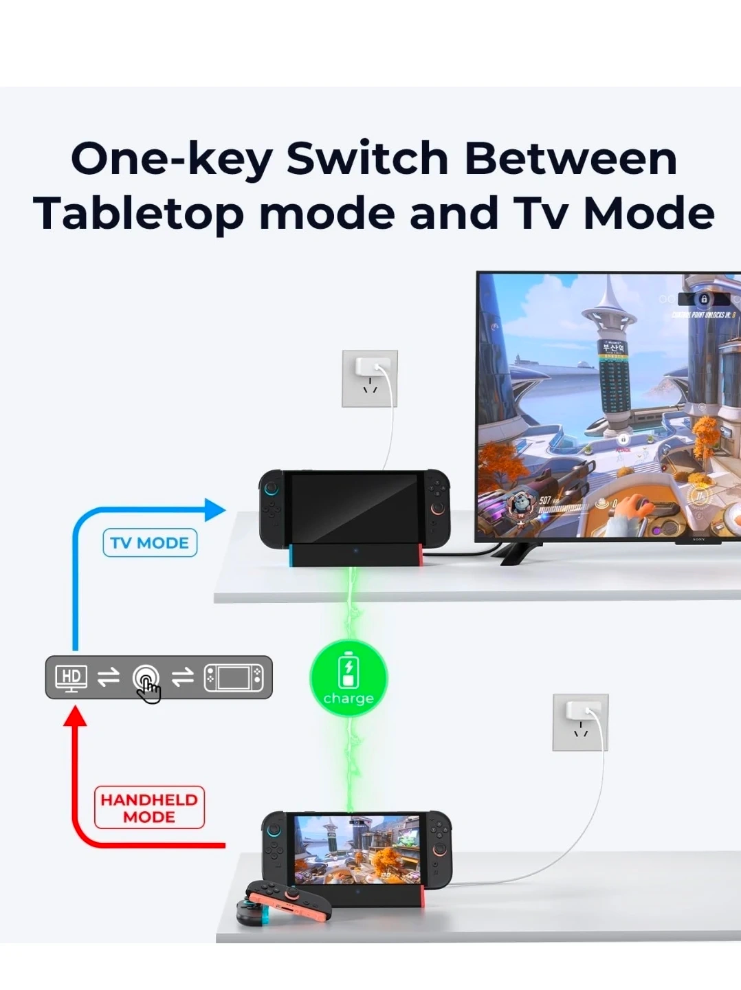 One-touch Display Switching: Press the TV/Tabletop Mode button at the back of the dock, you can choose Tabletop Mode or TV Output Mode. The Switch 2 dock comes with a 4K@60Hz HDMI 2.1 output. When you connect an external 4K monitor, it can provide you sharper and smoother visual experience, so you can enjoy the visual feast on your games.