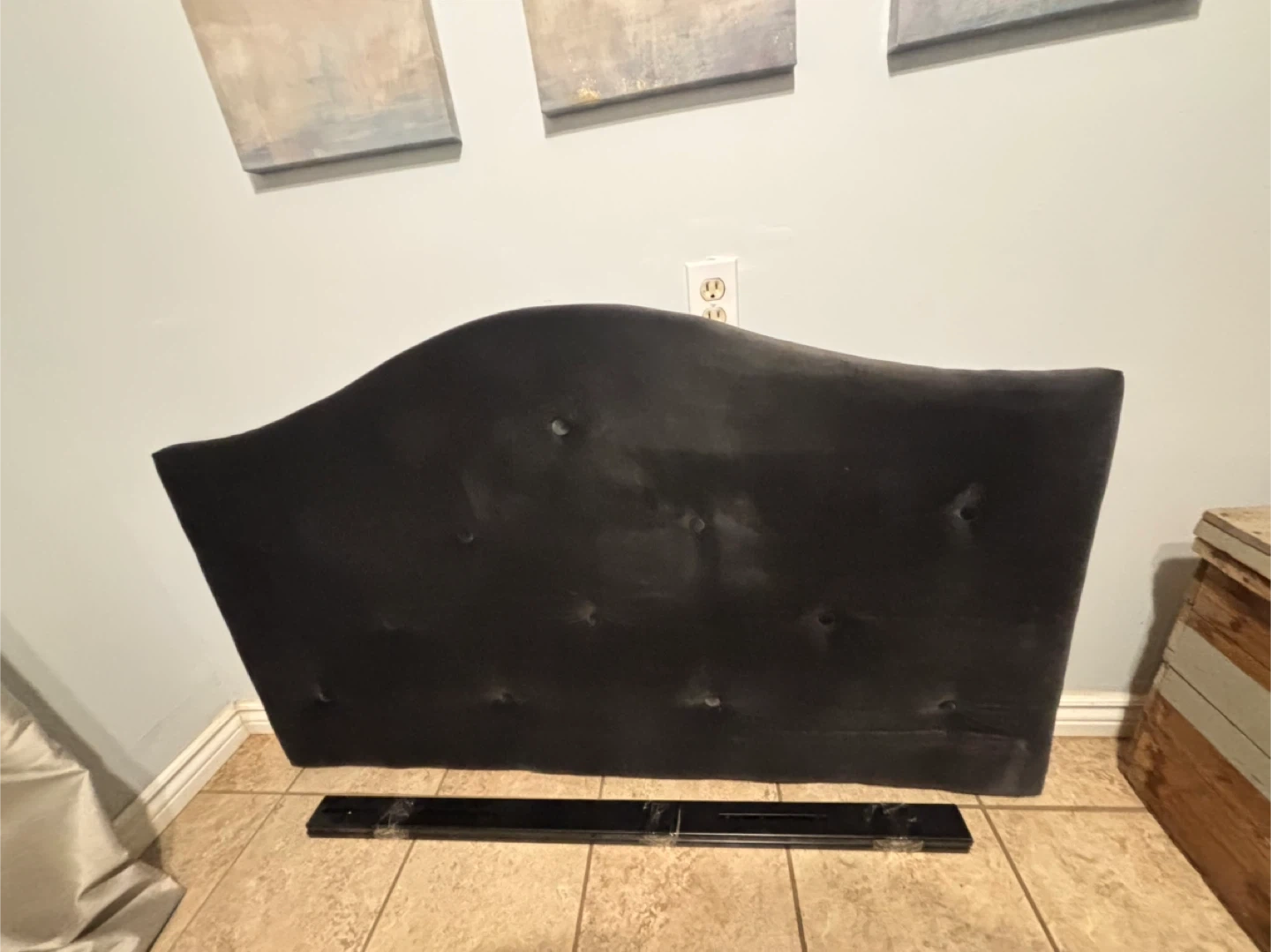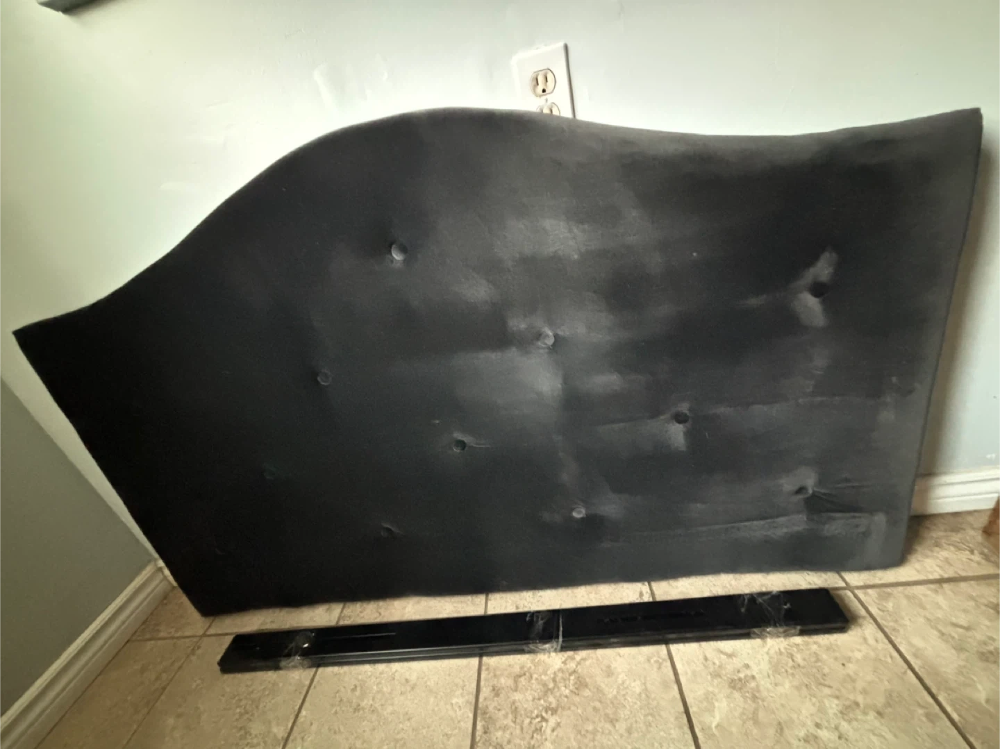 A dark grey, tufted headboard with a curved silhouette. It's upholstered in a soft material and includes a metal support bar for attachment. This headboard adds a touch of elegance to any bedroom!