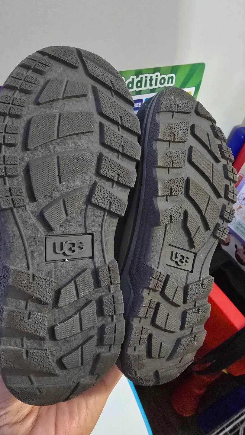 Ugg boots in a dark grey colour. They're fleece-lined for warmth. Water-resistant construction.