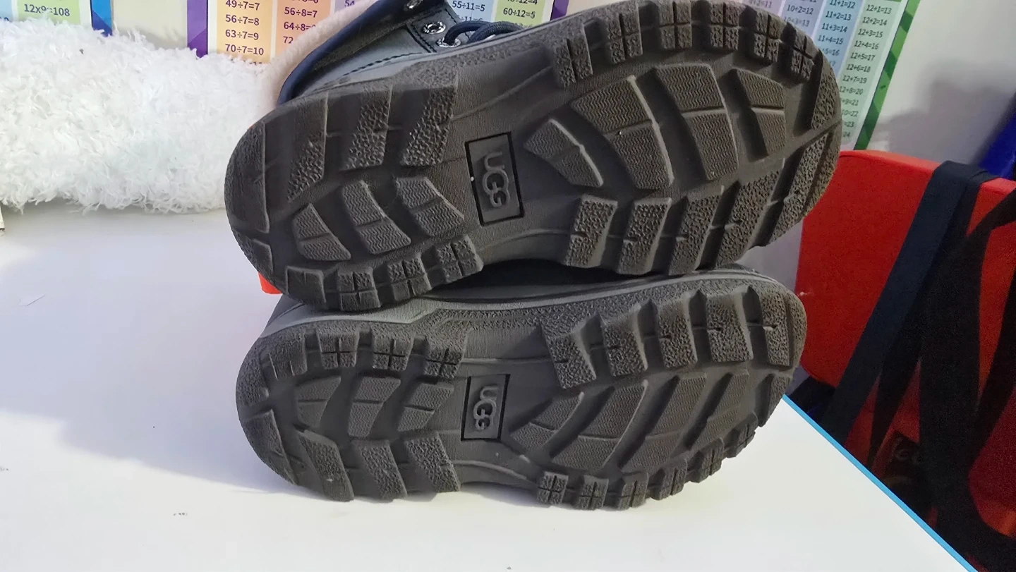 Ugg boots in a dark grey colour. They're fleece-lined for warmth. Water-resistant construction.