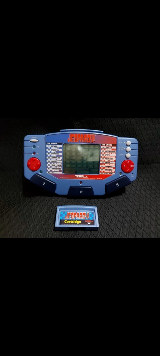 This handheld electronic game brings Jeopardy! to you. It includes the game unit and a Jeopardy! cartridge. Test your knowledge across various categories like history, science, and geography!