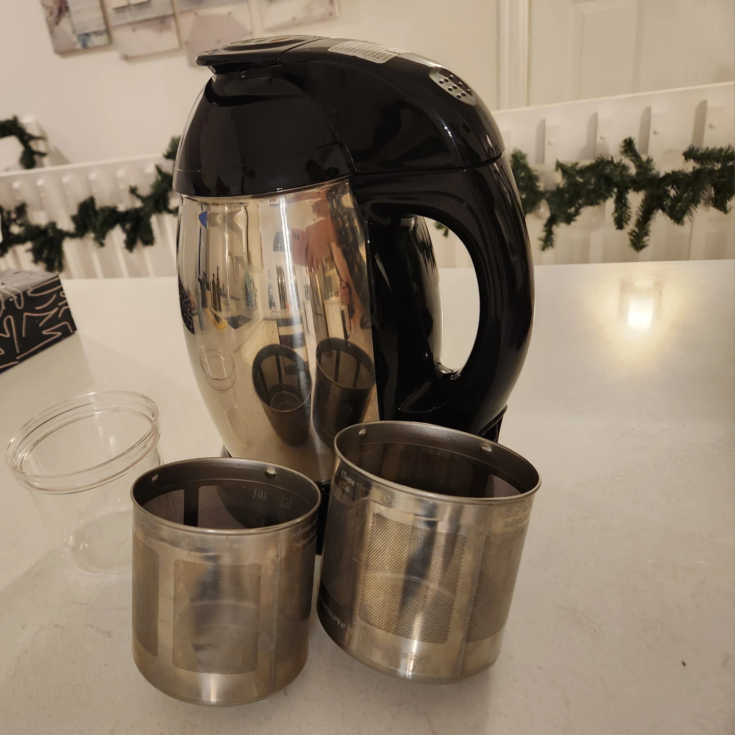 This is a soy milk maker machine with stainless steel components. It comes with multiple mesh filters for different uses. It's great for making fresh plant-based milk at home!