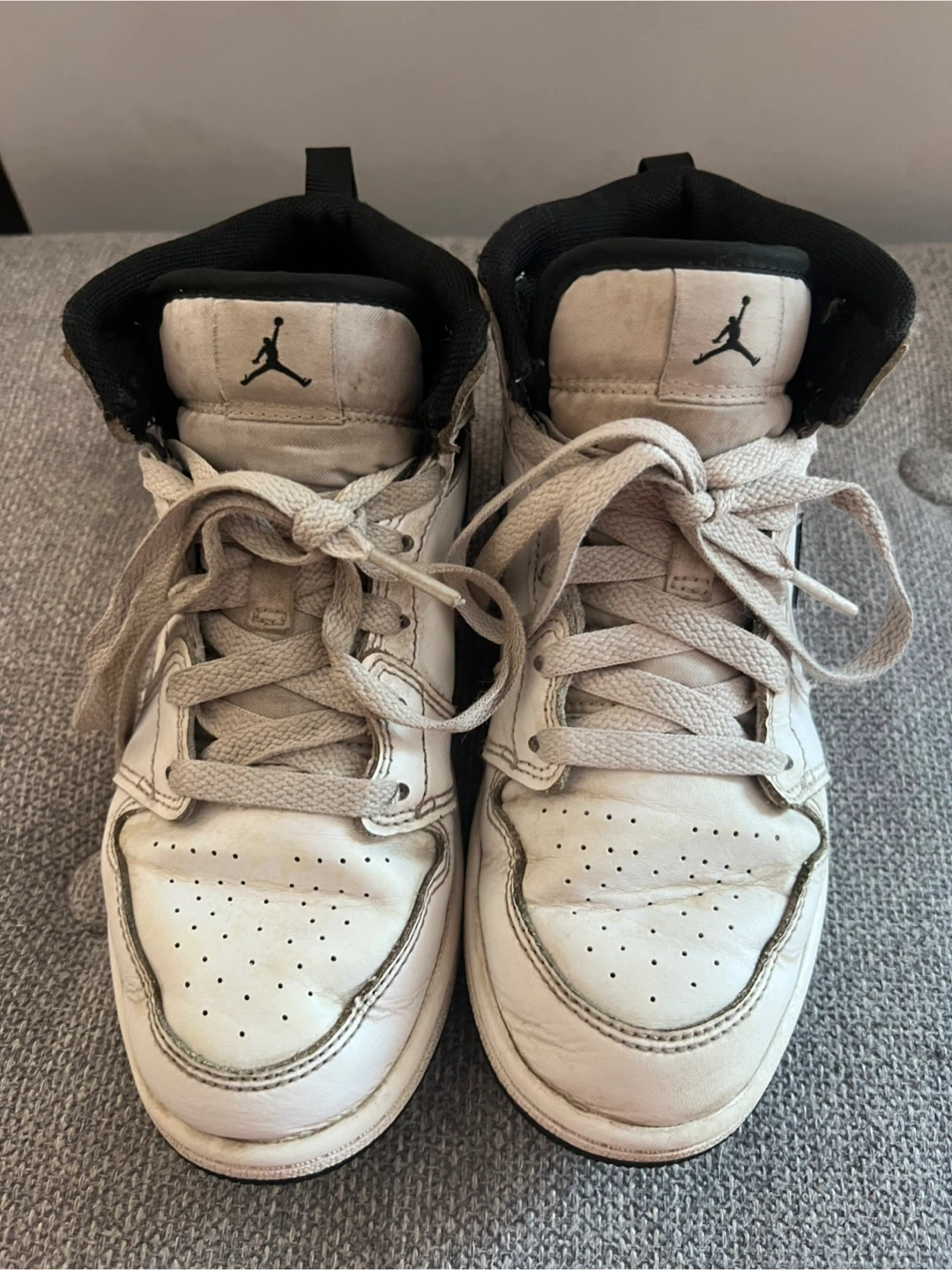 Kids sized Air Jordan Mid SE shoes. White leather upper with black accents. Classic high-top silhouette.