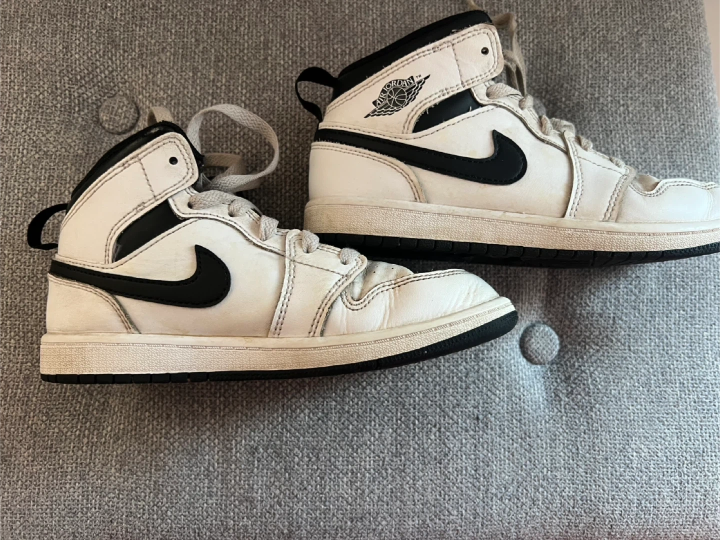 Kids sized Air Jordan Mid SE shoes. White leather upper with black accents. Classic high-top silhouette.