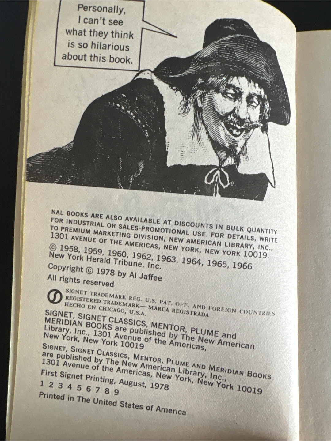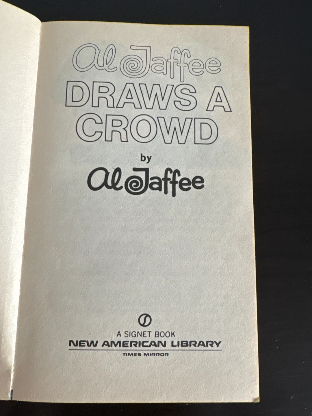 This is a humorous paperback book titled "Al Jaffee Draws A Crowd" by Al Jaffee. It contains artfully disguised humorous drawbacks. The first Signet printing was in August 1978. It's a collection of Al Jaffee's work.