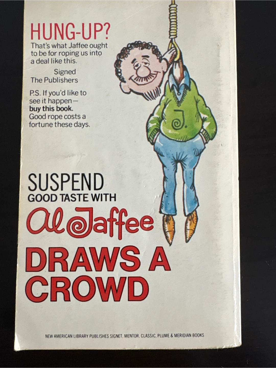This is a humorous paperback book titled "Al Jaffee Draws A Crowd" by Al Jaffee. It contains artfully disguised humorous drawbacks. The first Signet printing was in August 1978. It's a collection of Al Jaffee's work.
