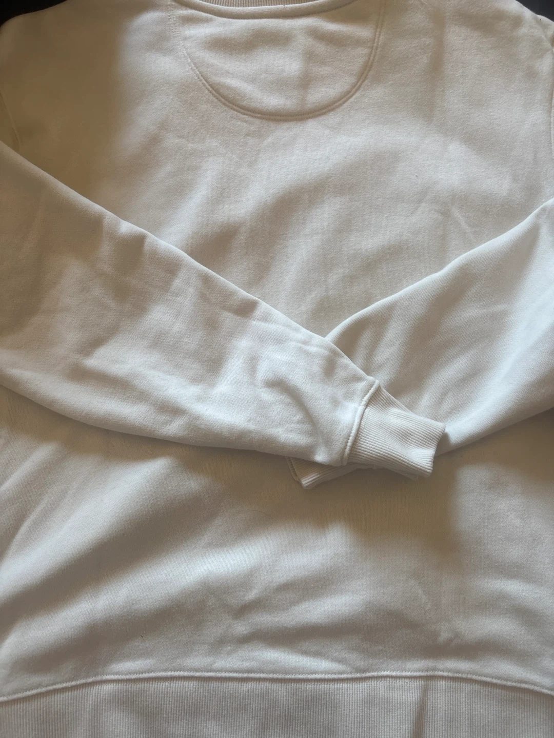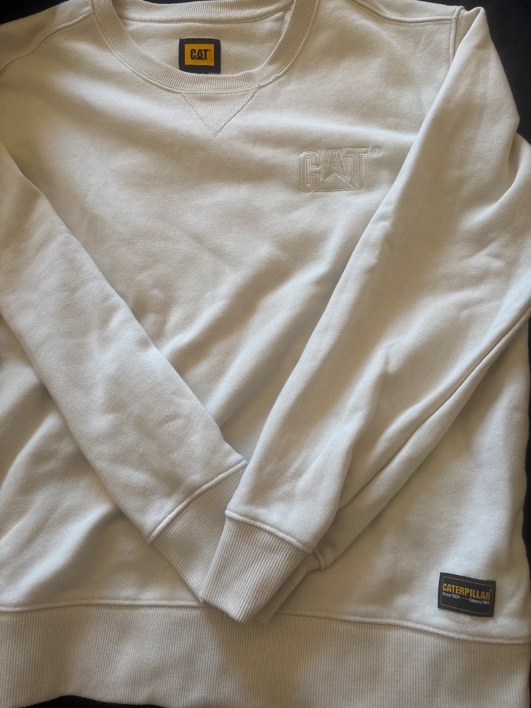 This is a Caterpillar CAT crewneck sweatshirt in a light cream colour. It's made of a comfortable cotton blend. Features embroidered CAT logo on the chest and a branded tag on the hem. Great for everyday wear!